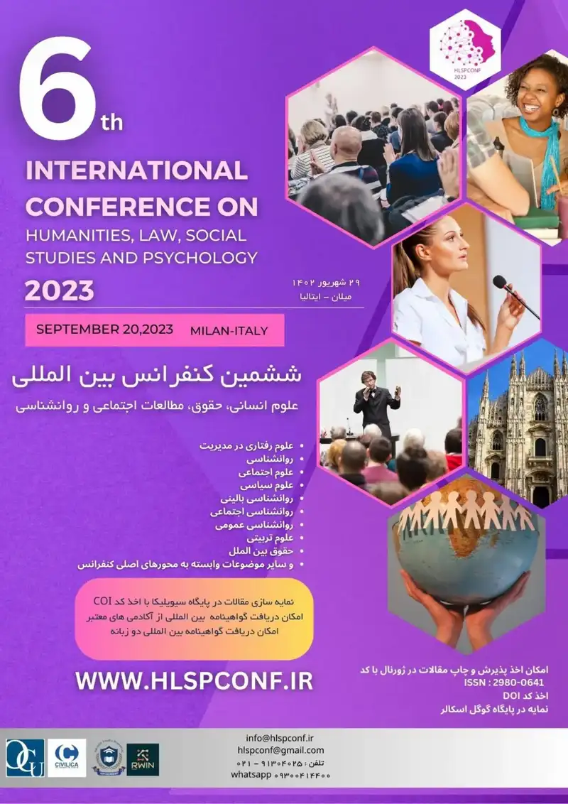 The 6th International Conference on Humanities, Law, Social Studies and Psychology In date 2023-09-20 by ,شركت همايش آروين البرز was held. please refer to the following link to download all the papers of conference proceedings: Proceedings The 6th International Conference on Humanities, Law, Social Studies and Psychology