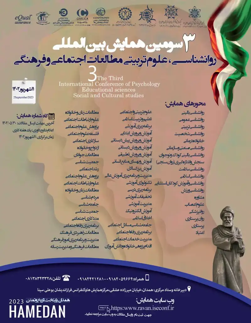 The third international conference of psychology, educational sciences, social and cultural studies In date 2023-09-02 by ,مرکز همایش ها و کنفرانس های فرازاندیشان بوعلی سینا in City Hamadan was held. please refer to the following link to download all the papers of conference proceedings: Proceedings The third international conference of psychology, educational sciences, social and cultural studies