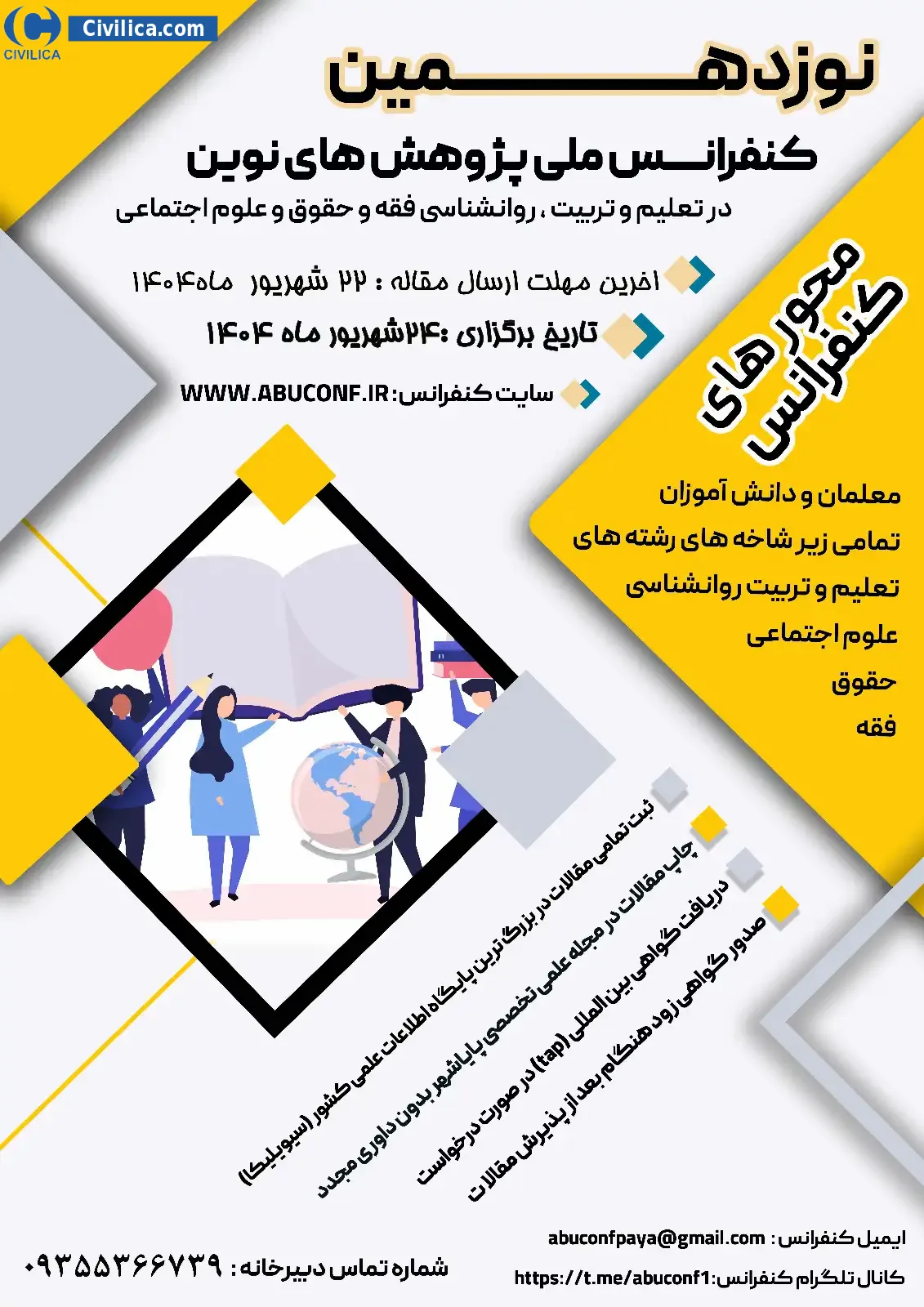 The 19th National Conference on Modern Research in Education, Psychology, Jurisprudence and Law, and Social Sciences In date 2025-09-15 by ,موسسه پایاشهرمجله علمی تخصصی پایاشهر دبیرخانه دائمی کنفرانس in City Shirvan was held. please refer to the following link to download all the papers of conference proceedings: Proceedings The 19th National Conference on Modern Research in Education, Psychology, Jurisprudence and Law, and Social Sciences