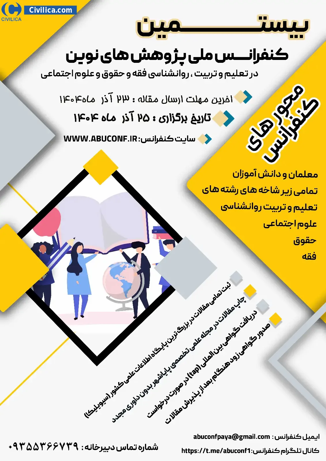 20th National Conference on Modern Research in Education, Psychology, Jurisprudence and Law, and Social Sciences In date 2025-12-16 by ,موسسه پایاشهر مجله علمی پایاشهردبیرخانه دائمی کنفرانس in City Shirvan will be held.Since the conference held officially, all of this Conference paper and proceedings will be indexed in the Civilica database and Iranian Consortium of National Content (ICNC) and you can have full confidence.