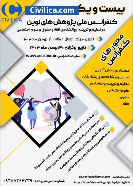 The 21st National Conference on Modern Research in Education, Psychology, Jurisprudence and Law, and Social Sciences In date 2026-02-02 by ,موسسه پایاشهرمجله علمی تخصصی پایاشهردبیرخانه دائمی کنفرانس in City Shirvan will be held.Since the conference held officially, all of this Conference paper and proceedings will be indexed in the Civilica database and Iranian Consortium of National Content (ICNC) and you can have full confidence.