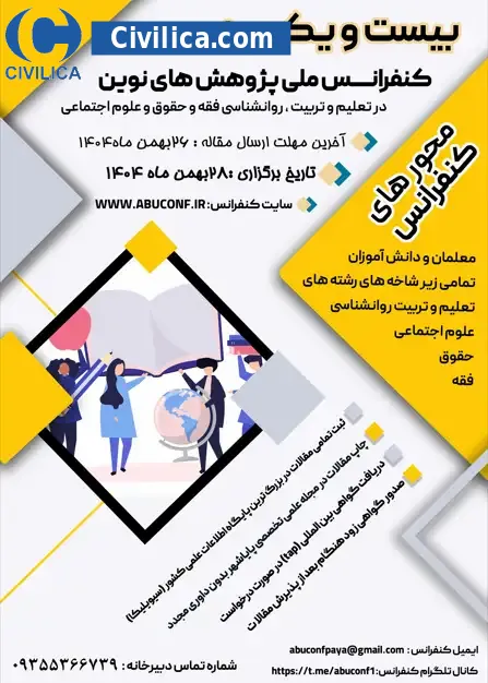 The 21st National Conference on Modern Research in Education, Psychology, Jurisprudence and Law, and Social Sciences In date 2026-02-17 by ,موسسه پایاشهرمجله علمی تخصصی پایاشهردبیرخانه دائمی کنفرانس in City Shirvan will be held.Since the conference held officially, all of this Conference paper and proceedings will be indexed in the Civilica database and Iranian Consortium of National Content (ICNC) and you can have full confidence.