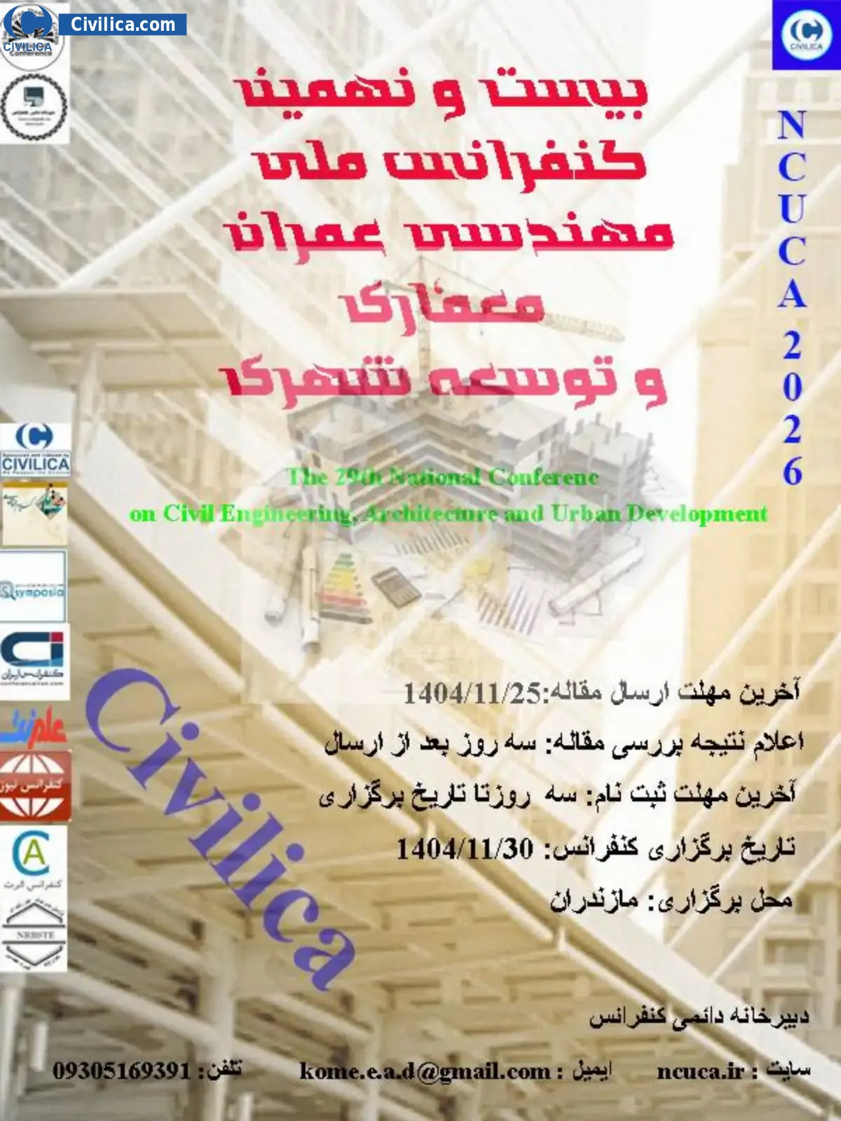 The 29th National Conference on Civil Engineering, Architecture and Urban Development In date 2026-02-19 by ,گروه علمی علم آوران دانش in City Babol will be held.Since the conference held officially, all of this Conference paper and proceedings will be indexed in the Civilica database and Iranian Consortium of National Content (ICNC) and you can have full confidence.