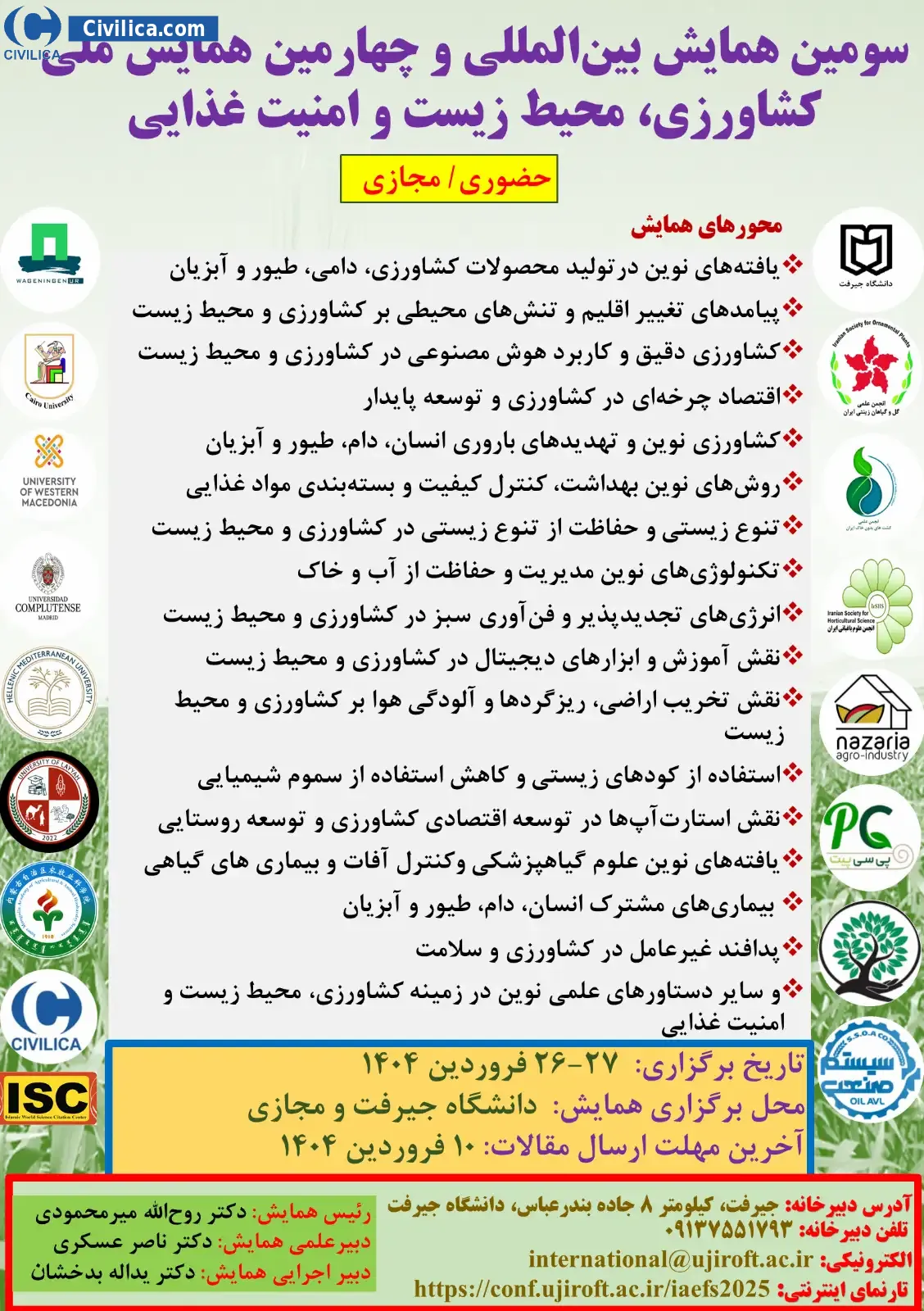 3rd International and 4th National Conference on Agriculture, Environment and Food Security In date 2025-04-15 by Jiroft University, in City Jiroft was held. please refer to the following link to download all the papers of conference proceedings: Proceedings 3rd International and 4th National Conference on Agriculture, Environment and Food Security