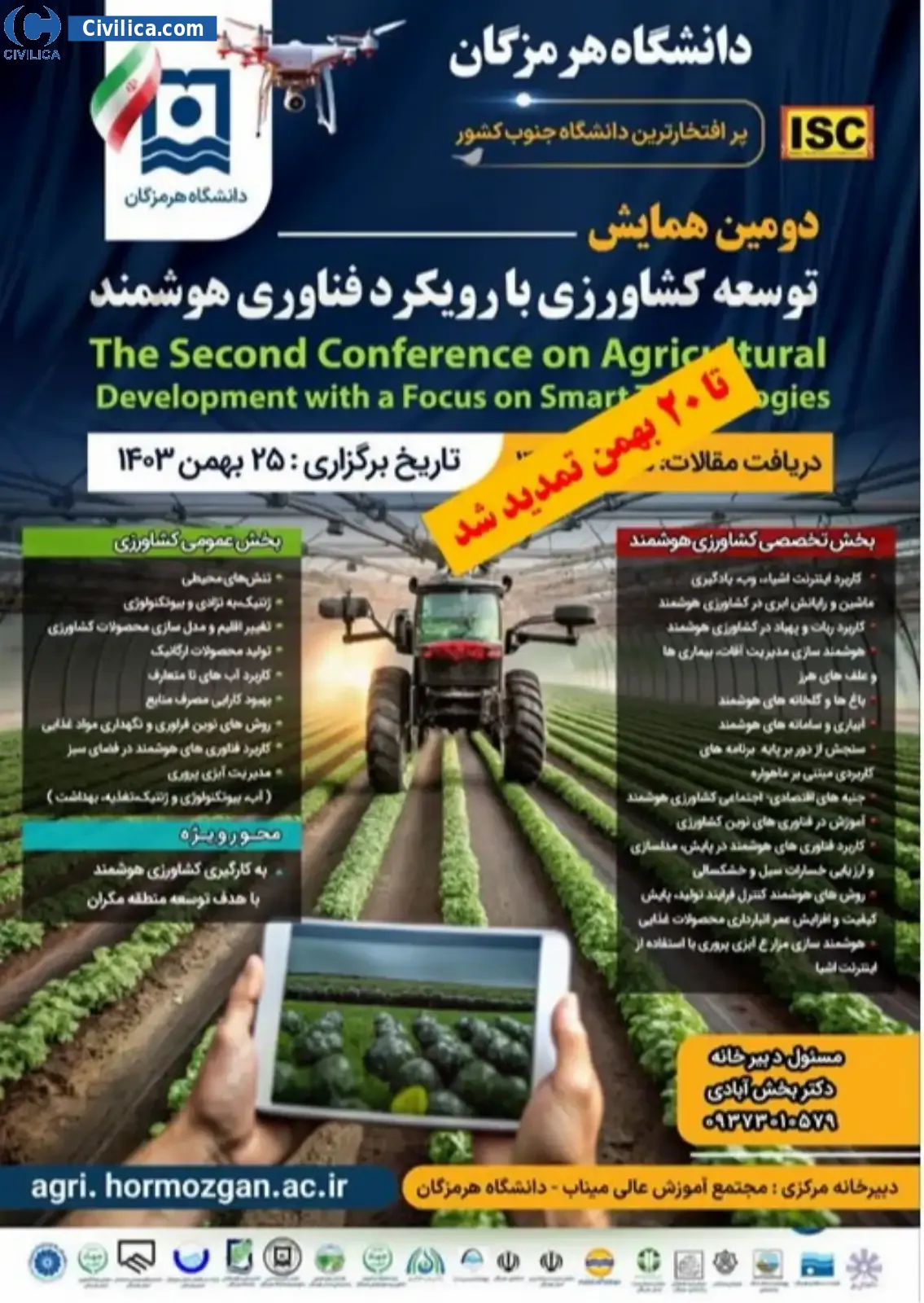2nd National Conference on Agricultural Development with a focus on Smart Technologies In date 2025-02-13 by Hormozgan University, in City Minab was held. please refer to the following link to download all the papers of conference proceedings: Proceedings 2nd National Conference on Agricultural Development with a focus on Smart Technologies
