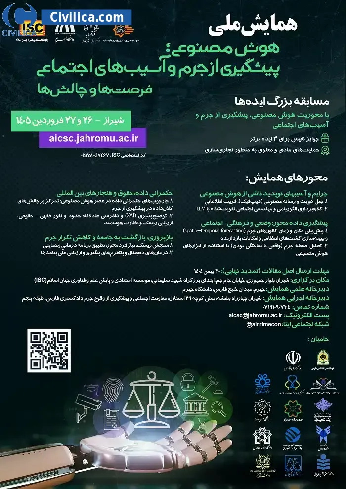 1st Artificial Intelligence Conference; Prevention of Crime and Social Harm, Opportunities and Challenges In date 2026-04-15 by Jahrom University, in City Jahrom will be held.Since the conference held officially, all of this Conference paper and proceedings will be indexed in the Civilica database and Iranian Consortium of National Content (ICNC) and you can have full confidence.
