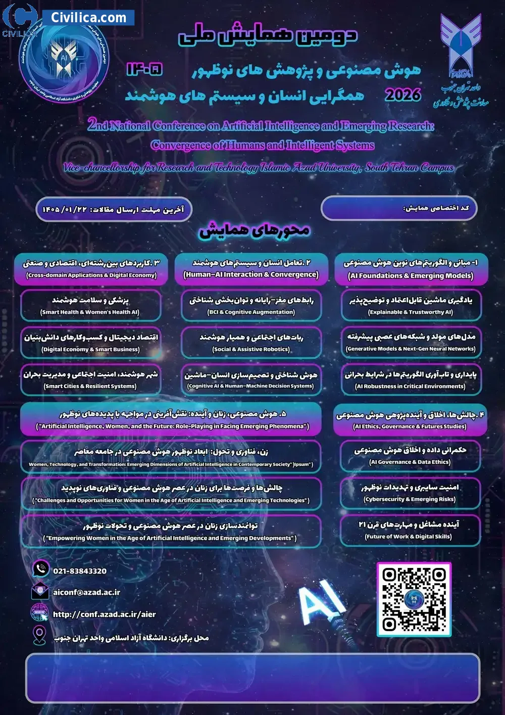 2nd National Conference on "Artificial Intelligence and Emerging Research: Convergence of Humans and Intelligent Systems In date 2026-04-28 by Islamic Azad University of South Tehran, in City Tehran will be held.Since the conference held officially, all of this Conference paper and proceedings will be indexed in the Civilica database and Iranian Consortium of National Content (ICNC) and you can have full confidence.