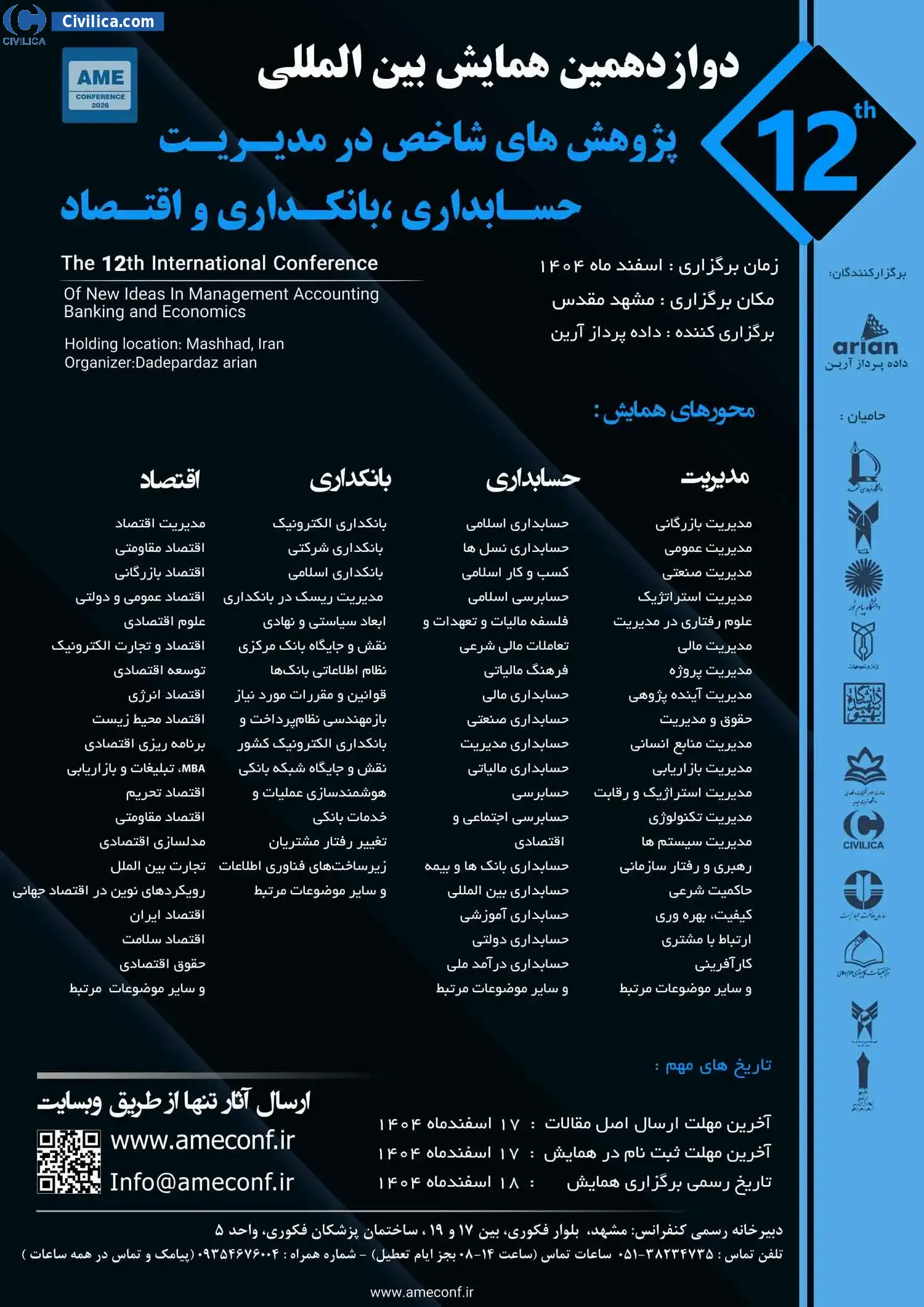 The 12th international conference on key researches in management, accounting, banking and economics In date 2026-03-09 by ,داده پرداز آرین با همکاری دانشگاههای معتبر ایران in City Mashhad will be held.Since the conference held officially, all of this Conference paper and proceedings will be indexed in the Civilica database and Iranian Consortium of National Content (ICNC) and you can have full confidence.