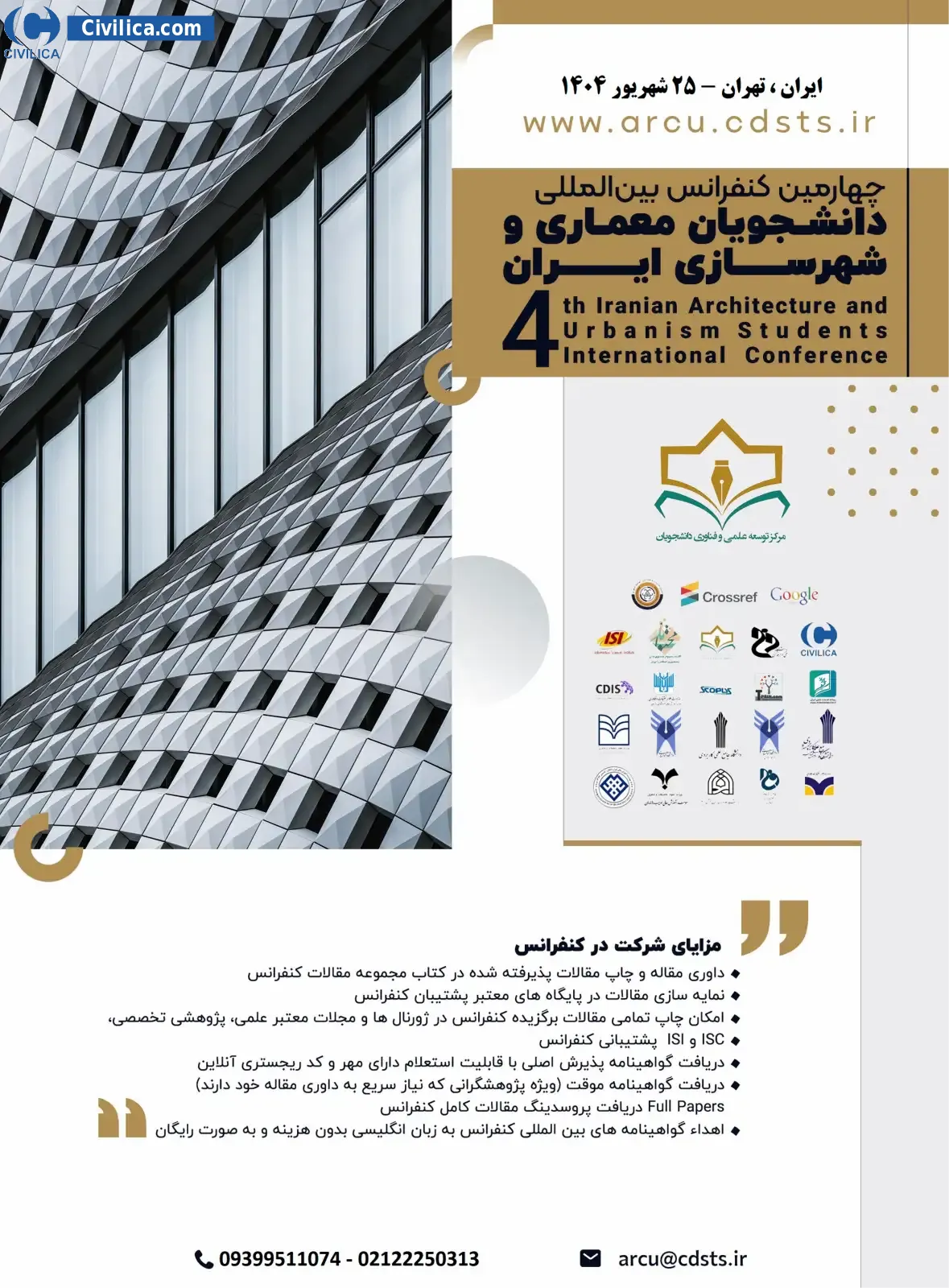 Fourth Iranian Architecture and Urbanism Students International Conference In date 2025-09-16 by ,مرکز توسعه علمی و فناوری دانشجویاندبیرخانه دائمی کنفرانس in City Tehran was held. please refer to the following link to download all the papers of conference proceedings: Proceedings Fourth Iranian Architecture and Urbanism Students International Conference
