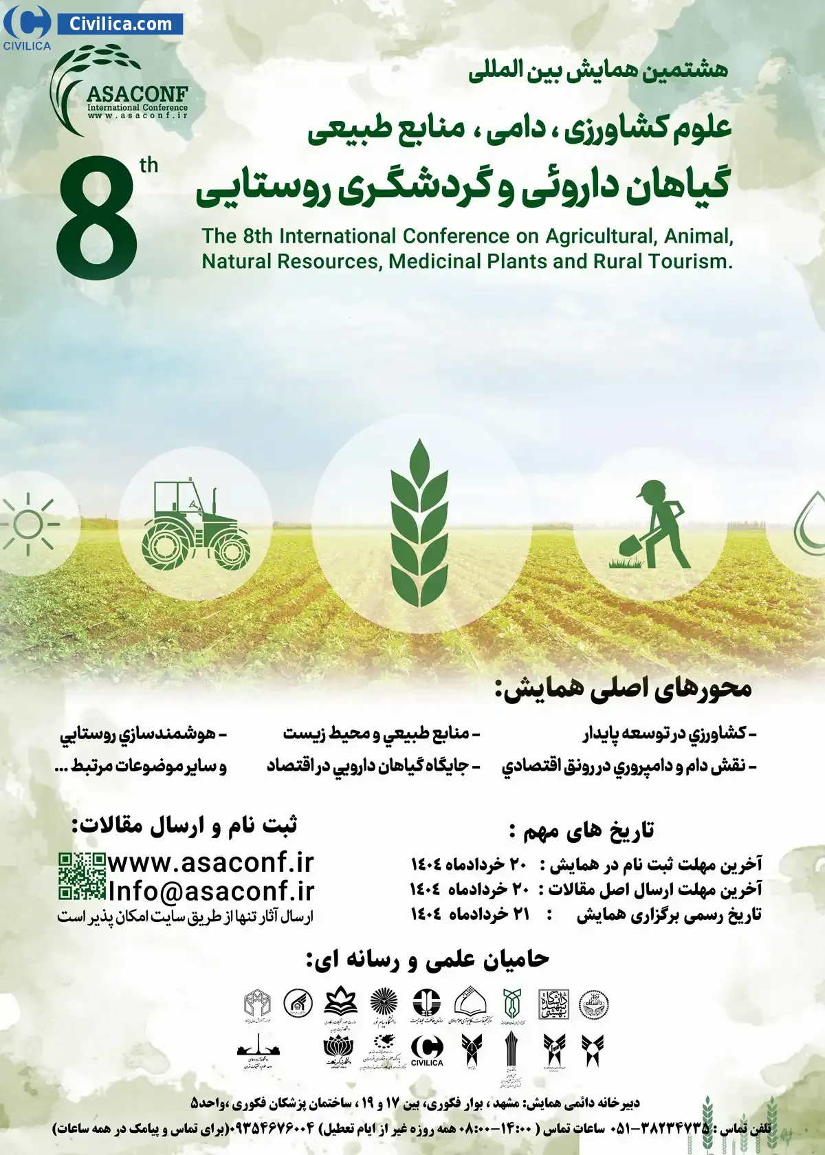The 8th International Conference on Agricultural, Animal, Natural Resources, Medicinal Plants and Rural Tourism In date 2025-06-11 by ,داده پرداز آرین با همکاری دانشگاههای معتبر ایران in City Mashhad was held. please refer to the following link to download all the papers of conference proceedings: Proceedings The 8th International Conference on Agricultural, Animal, Natural Resources, Medicinal Plants and Rural Tourism