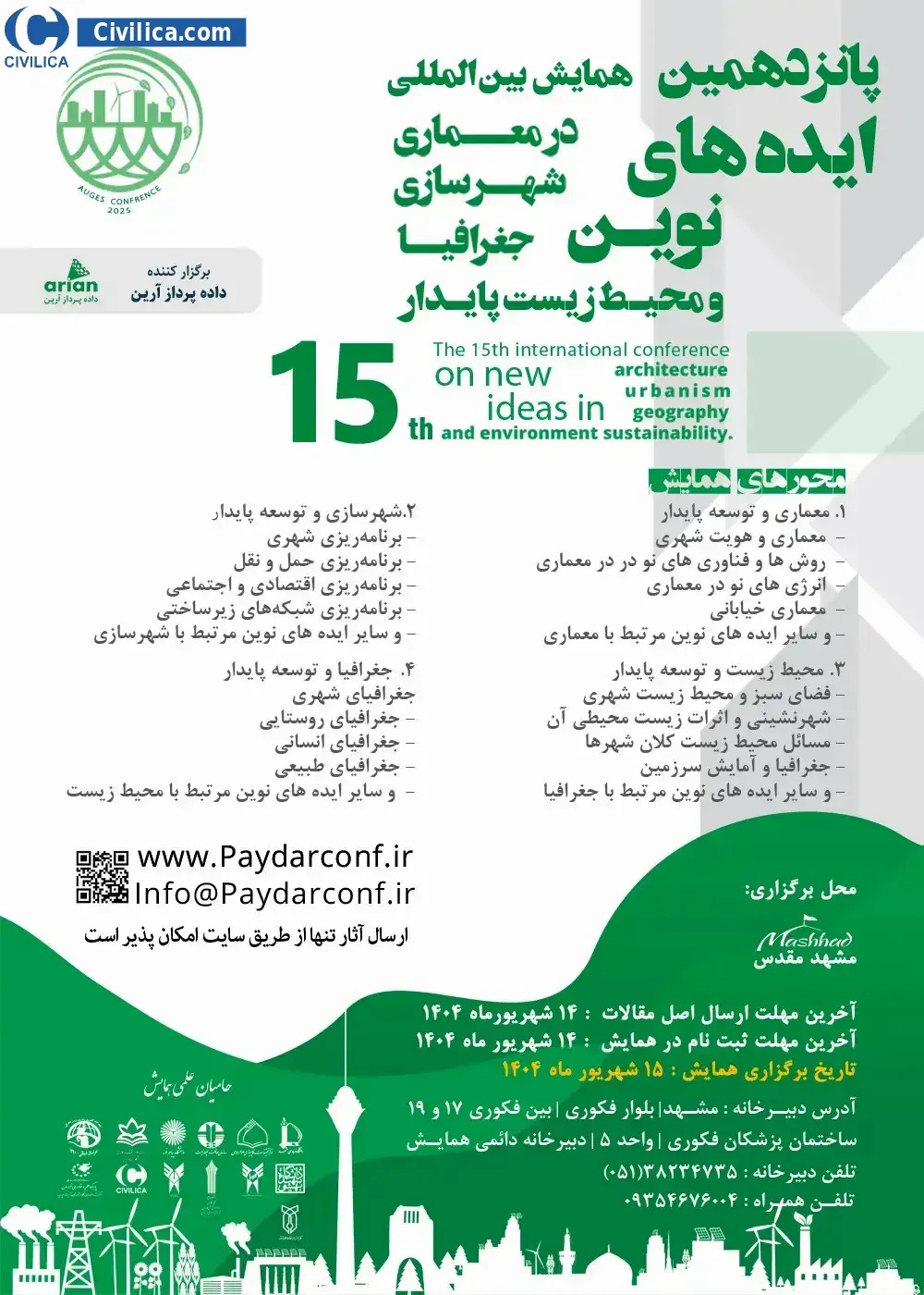 The 15th International Conference on New Ideas in Architecture, Urban Planning, Geography and Sustainable Environment In date 2025-09-06 by ,داده پرداز آرین با همکاری دانشگاههای معتبر ایران in City Mashhad was held. please refer to the following link to download all the papers of conference proceedings: Proceedings The 15th International Conference on New Ideas in Architecture, Urban Planning, Geography and Sustainable Environment