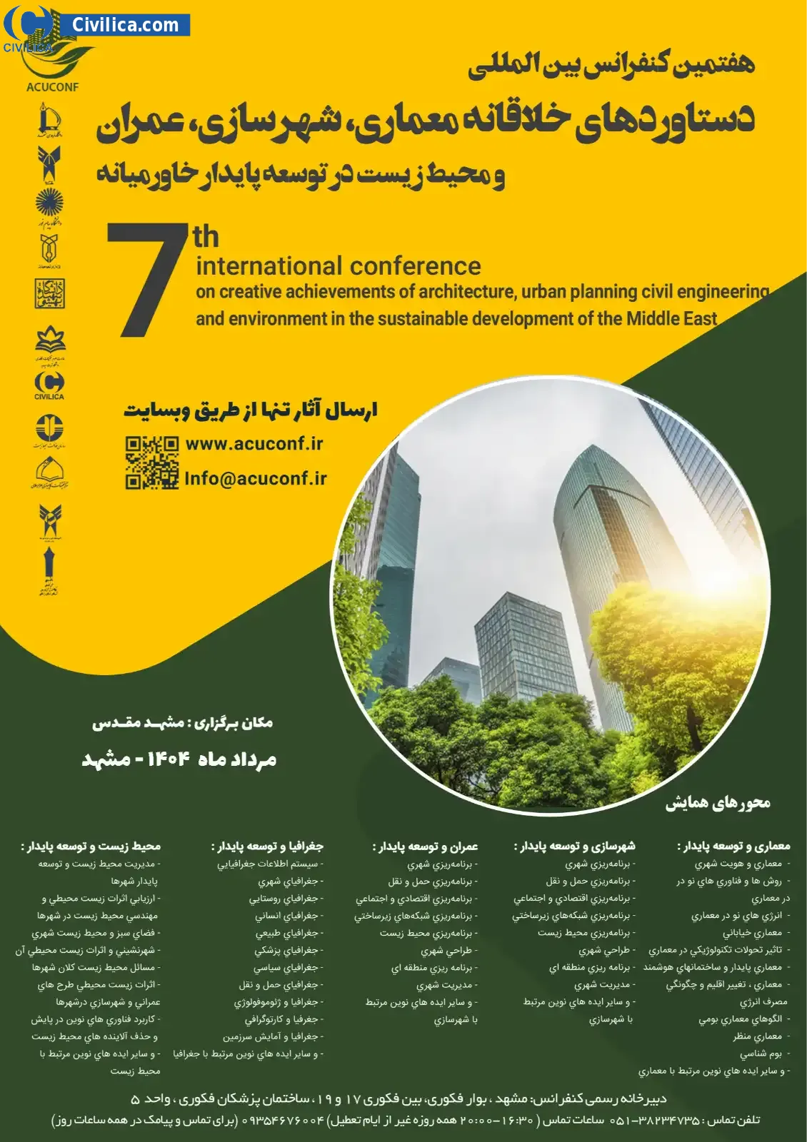 The 7th international conference on creative achievements of architecture, urban planning, civil engineering and environment in the sustainable development of the Middle East In date 2025-08-06 by ,داده پرداز آرین با همکاری دانشگاههای معتبر ایران in City Mashhad was held. please refer to the following link to download all the papers of conference proceedings: Proceedings The 7th international conference on creative achievements of architecture, urban planning, civil engineering and environment in the sustainable development of the Middle East