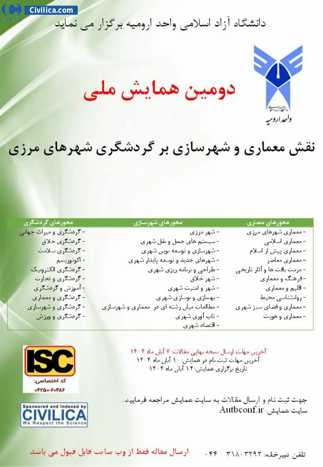 The Second national conference on the role of architecture and urban planning on the tourism of the border cities In date 2025-11-05 by Islamic Azad University of Urmia, in City Urmia was held.This conference is held by Civilica Sponsoring and articles and will be indexed in CIVILICA