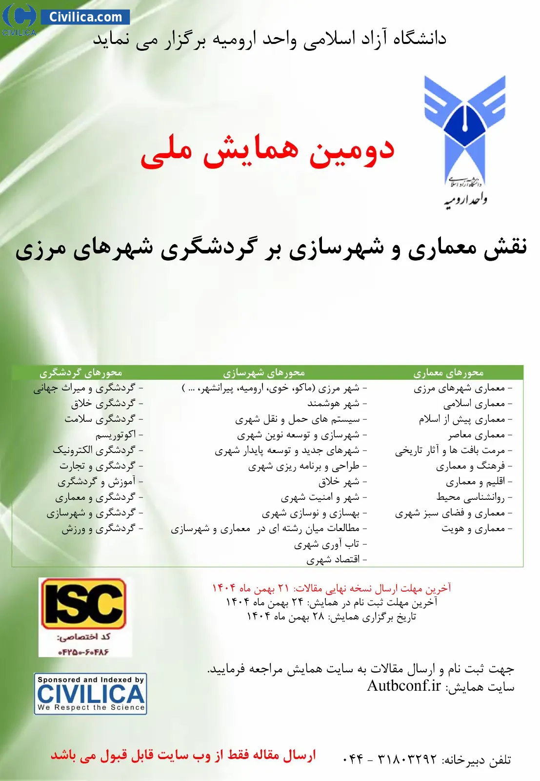 The Second national conference on the role of architecture and urban planning on the tourism of the border cities In date 2026-02-17 by Islamic Azad University of Urmia, in City Urmia will be held.Since the conference held officially, all of this Conference paper and proceedings will be indexed in the Civilica database and Iranian Consortium of National Content (ICNC) and you can have full confidence.