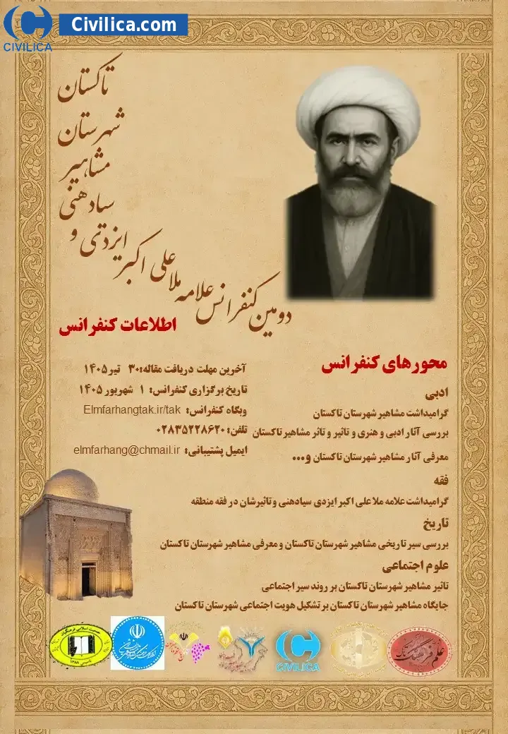 The second conference of Allama Mullah Ali Akbar Izadi Siyadhani and the celebrities of Takestan city In date 2026-08-23 by ,موسسه فرهنگی هنری پژوهشی علم فرهنگ تاکموسسه آموزش عالی تاکستان in City Takestan will be held.Since the conference held officially, all of this Conference paper and proceedings will be indexed in the Civilica database and Iranian Consortium of National Content (ICNC) and you can have full confidence.