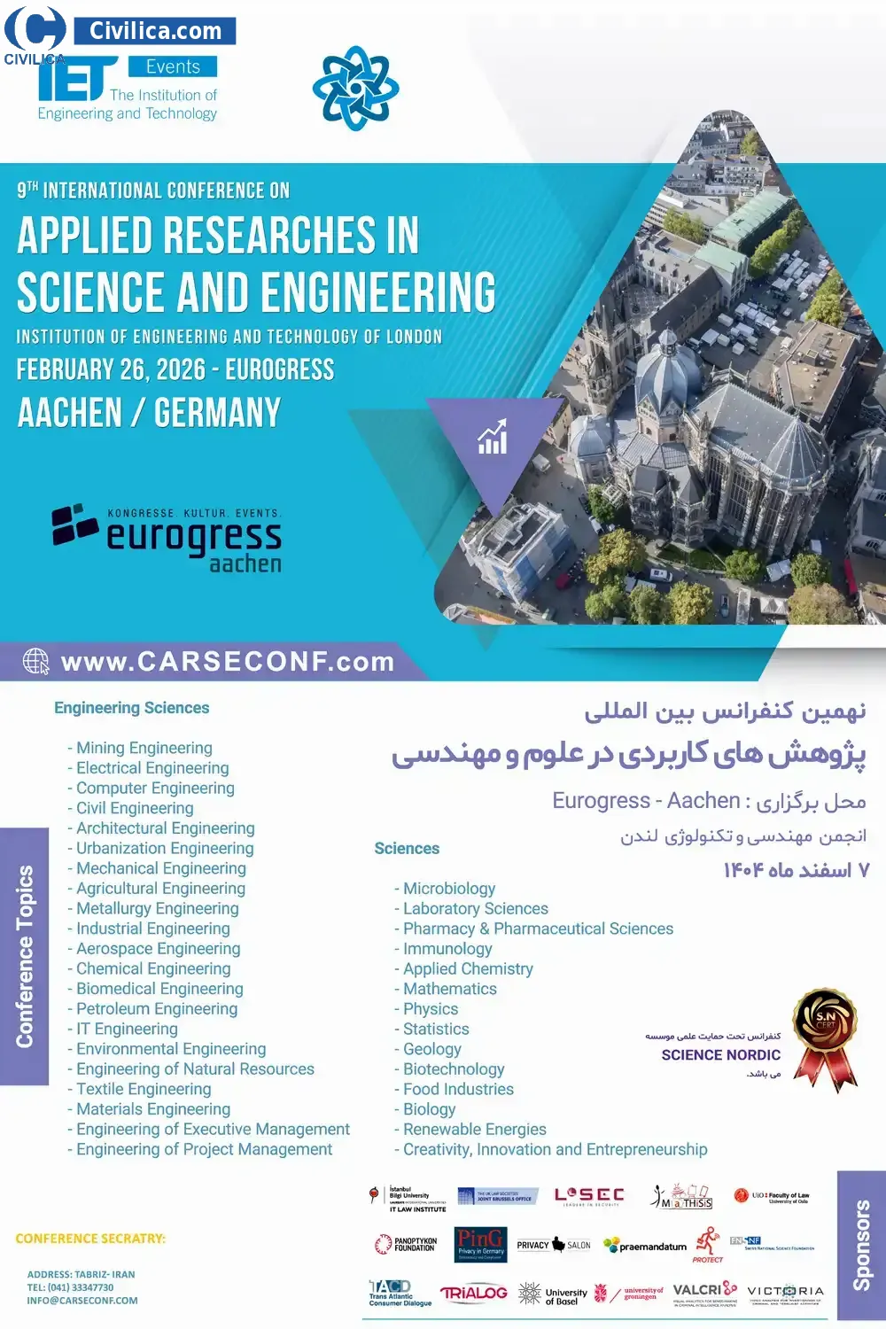9th International Conference on Applied Researches in Science & Engineering In date 2026-02-26 by ,انجمن مهندسی و تکنولوژی لندن will be held.Since the conference held officially, all of this Conference paper and proceedings will be indexed in the Civilica database and Iranian Consortium of National Content (ICNC) and you can have full confidence.