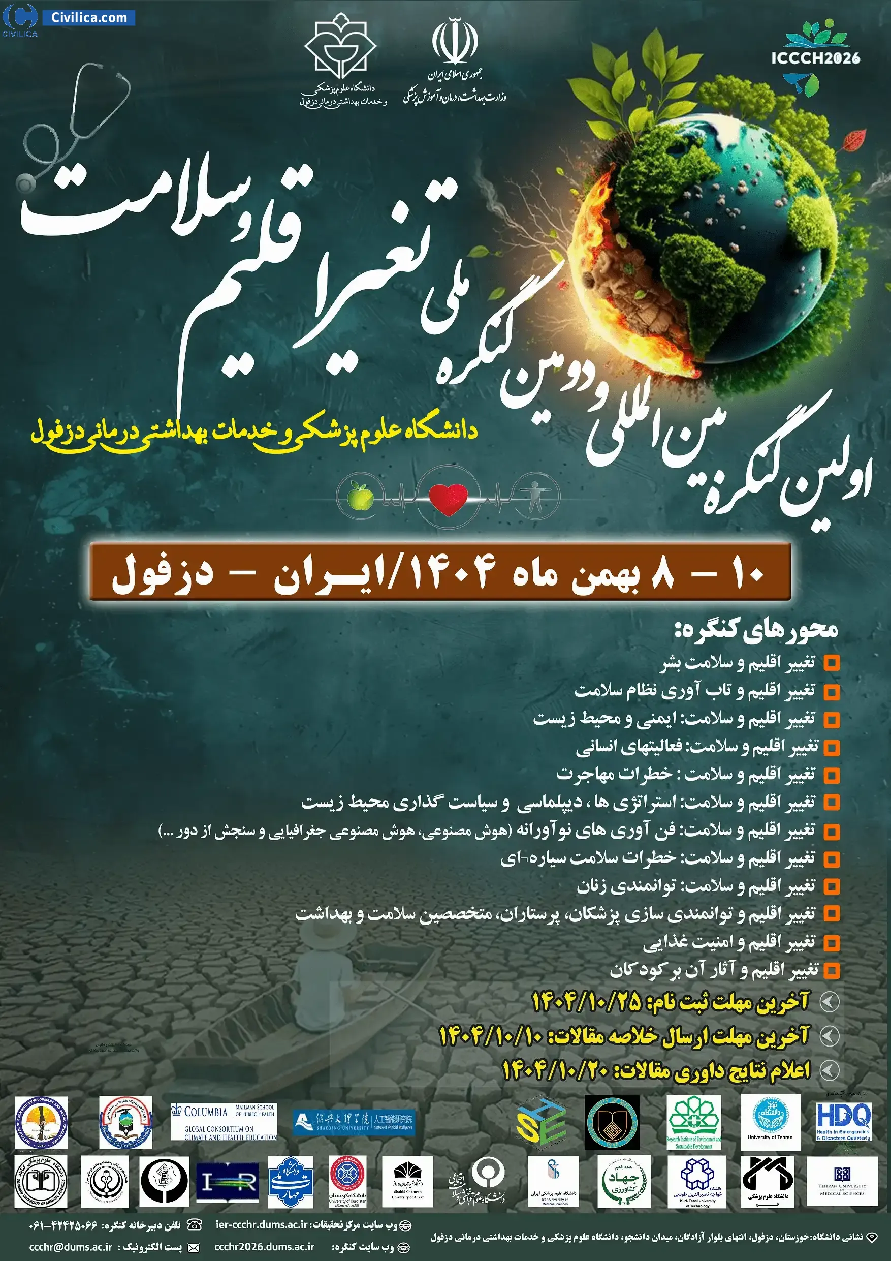 The First International Congress and the Second National Congress on Climate Change and Health In date 2026-01-28 by Dezful University of Medical Sciences, in City Dezful will be held.Since the conference held officially, all of this Conference paper and proceedings will be indexed in the Civilica database and Iranian Consortium of National Content (ICNC) and you can have full confidence.