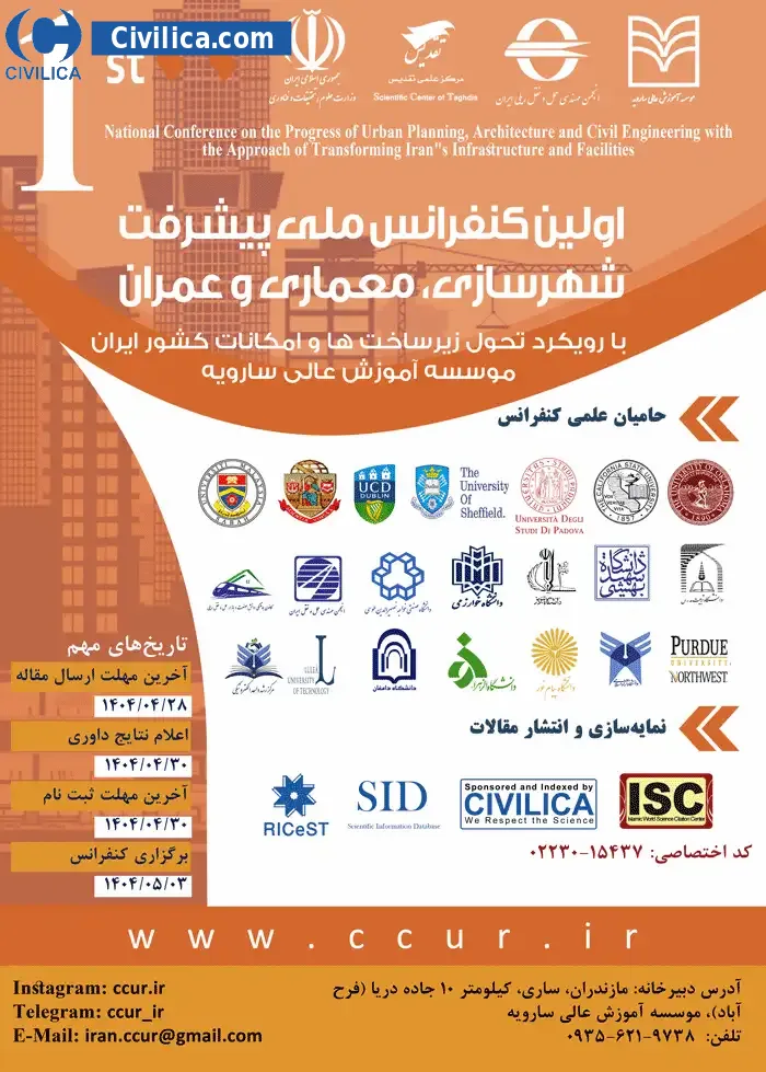 The first national conference on the progress of urban development, architecture and civil engineering In date 2025-07-25 by Saroyeh Higher Education Institute,Iranian Association of Transport Engineeringمرکز علمی تقدیس in City Sari was held. please refer to the following link to download all the papers of conference proceedings: Proceedings The first national conference on the progress of urban development, architecture and civil engineering