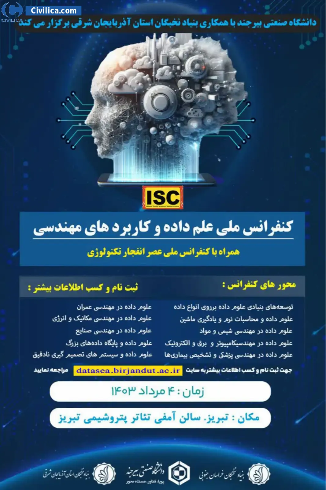 National Conference on Data Science and Engineering Applications In date 2024-07-25 by Birjand University of Technology,بنیاد نخبگان استان آذربایجان شرقیشرکت تامین صنعت تجارت آزاد in City Tabriz was held. please refer to the following link to download all the papers of conference proceedings: Proceedings National Conference on Data Science and Engineering Applications