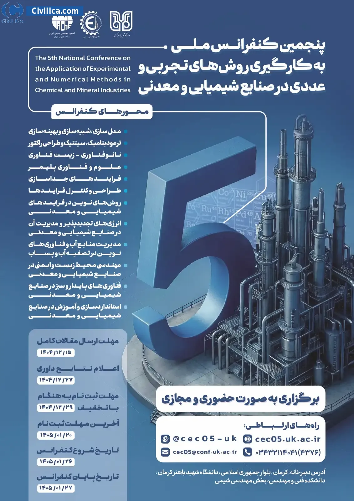 The 5th National Conference on the Application of Experimental and Numerical Methods in Chemical and Mineral Industries In date 2026-04-15 by Shahid Bahonar University, in City Kerman will be held.Since the conference held officially, all of this Conference paper and proceedings will be indexed in the Civilica database and Iranian Consortium of National Content (ICNC) and you can have full confidence.
