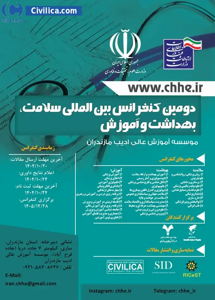 2nd international conference on health, hygiene and education In date 2027-03-18 by Adib institution of higher education in Mazandaran,مرکز علمي تقديس in City Sari will be held.Since the conference held officially, all of this Conference paper and proceedings will be indexed in the Civilica database and Iranian Consortium of National Content (ICNC) and you can have full confidence.