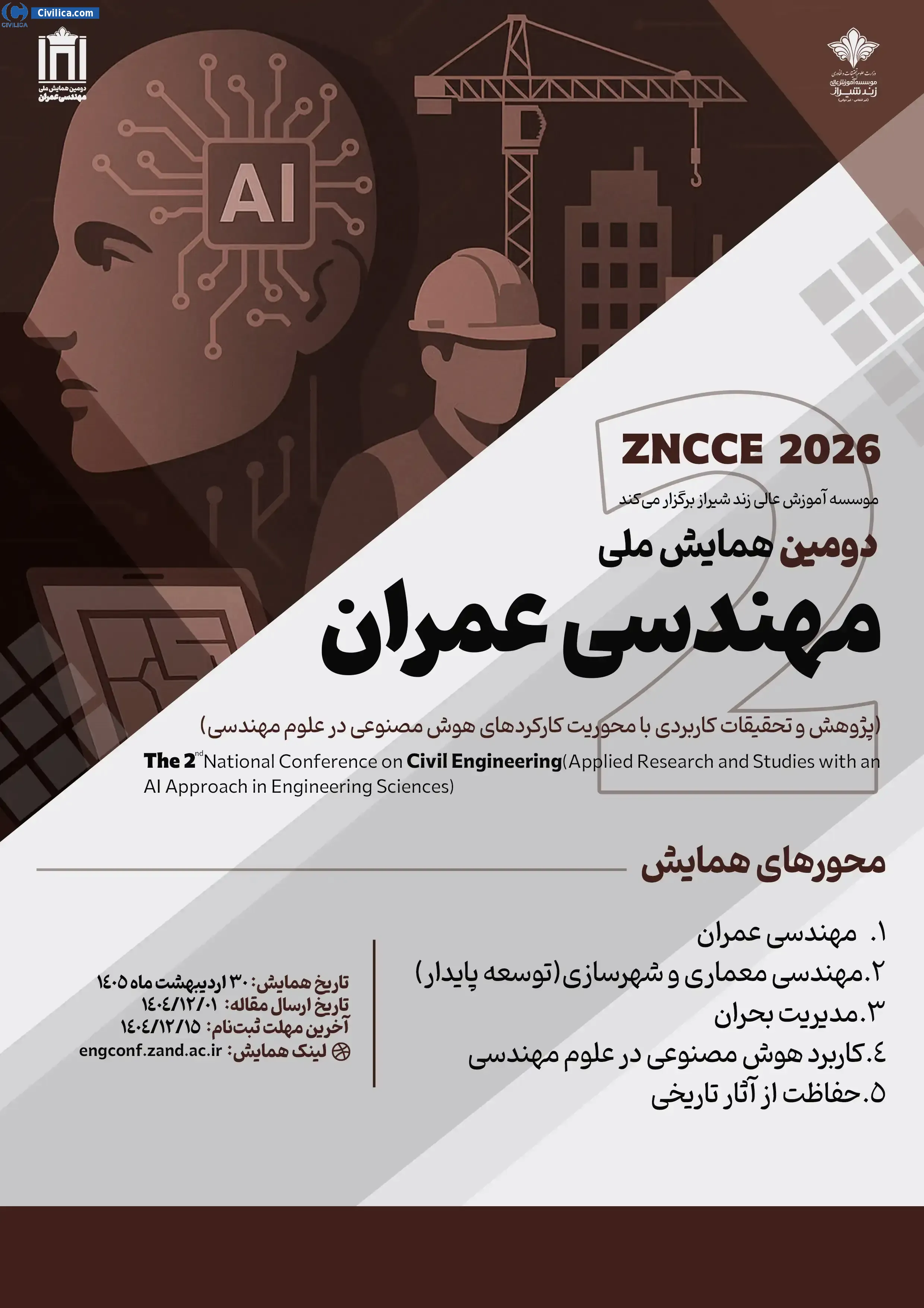 The 2nd National Conference on Civil Engineering(Applied Research and Studies with an AI Approach in Engineering Sciences) In date 2026-05-20 by Zand Institute of Higher Education, in City Shiraz will be held.Since the conference held officially, all of this Conference paper and proceedings will be indexed in the Civilica database and Iranian Consortium of National Content (ICNC) and you can have full confidence.