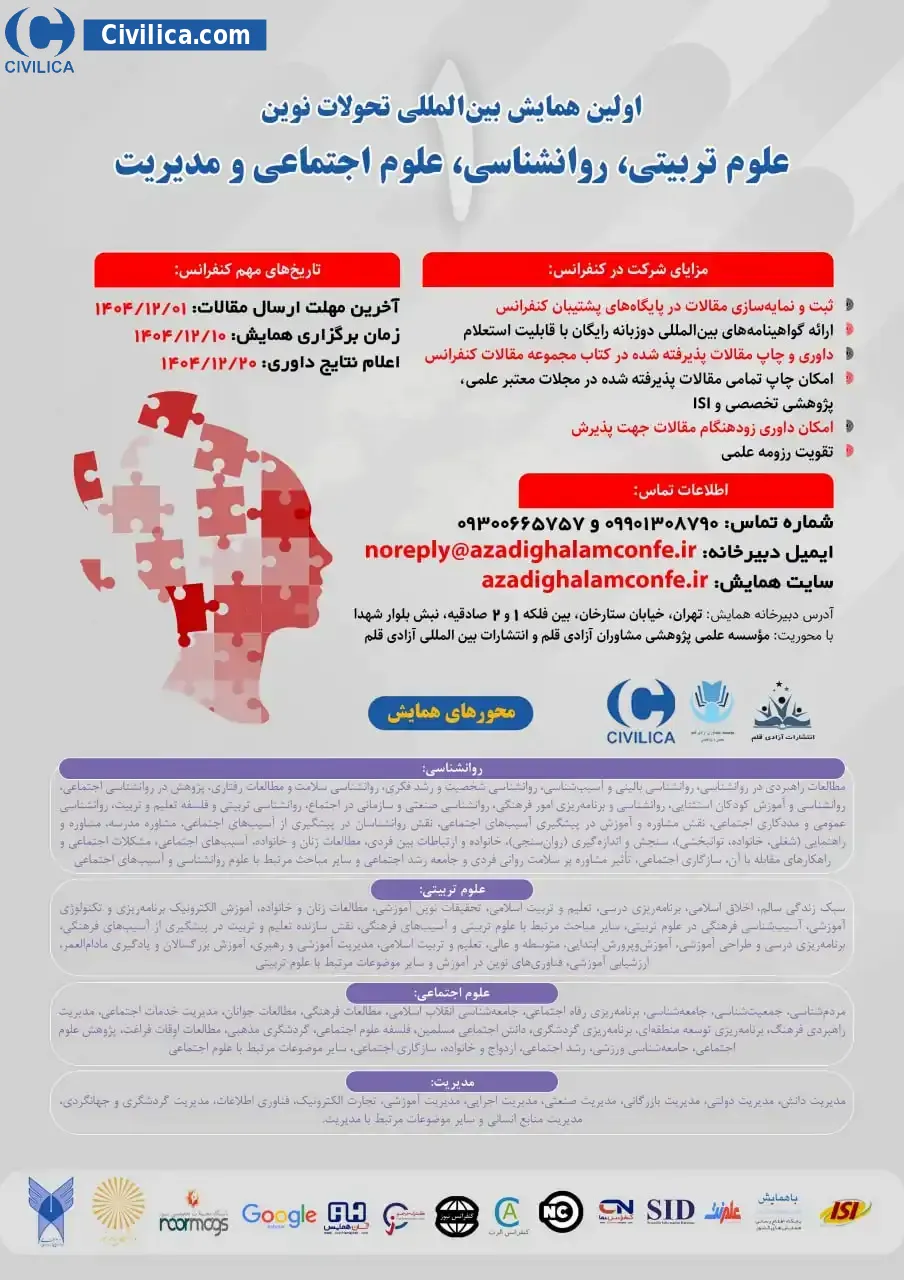 The first international conference on new developments in educational sciences, psychology, social sciences and management In date 2026-03-01 by ,مؤسسه علمی پژوهشی مشاوران آزادی قلمانتشارات بین المللی آزادی قلم in City Tehran will be held.Since the conference held officially, all of this Conference paper and proceedings will be indexed in the Civilica database and Iranian Consortium of National Content (ICNC) and you can have full confidence.
