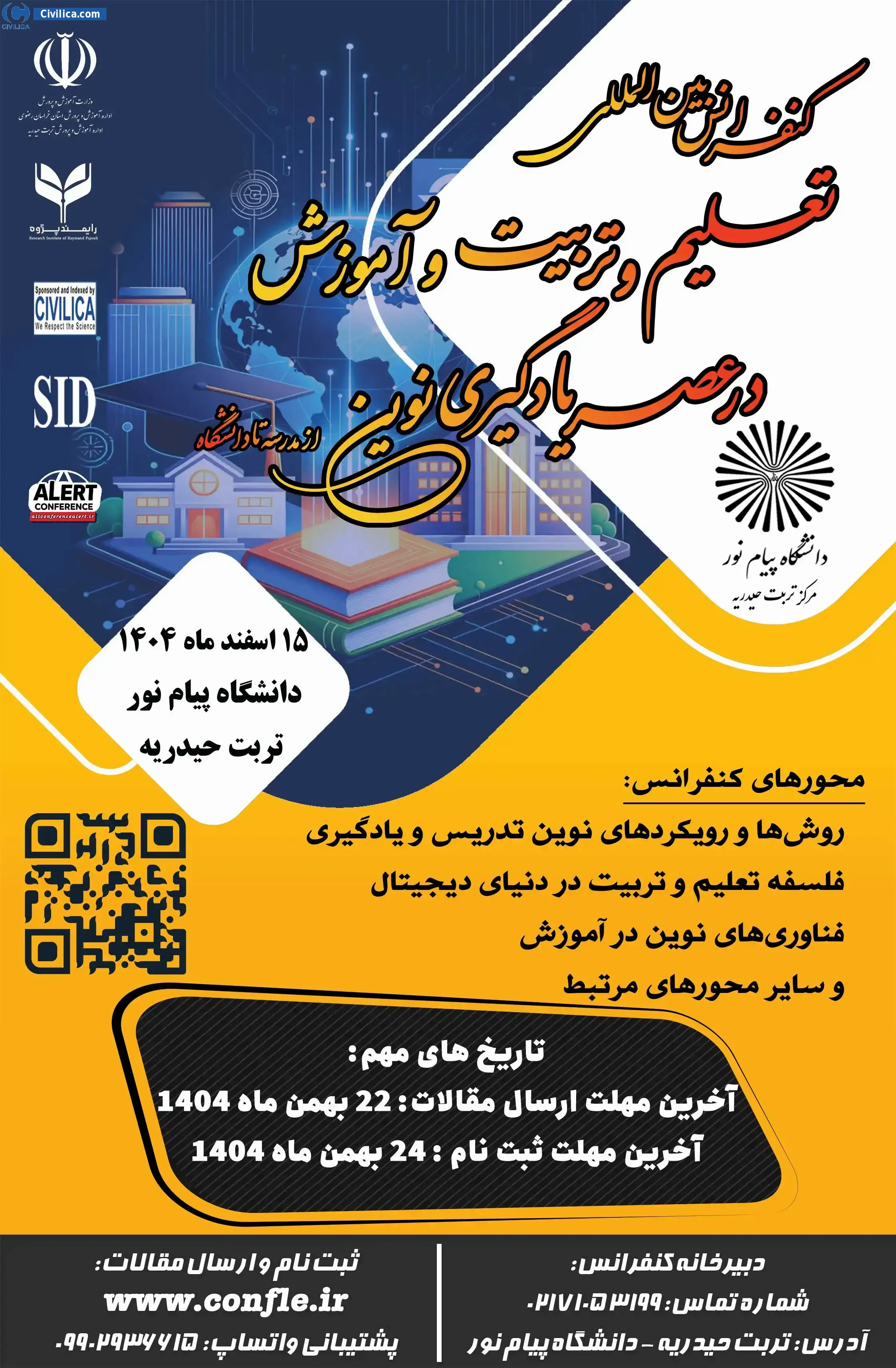International Conference on Education and Training in the Era of Modern Learning In date 2026-03-06 by ,دانشگاه پیام نور مرکز تربت حیدریه در همکاری مشترک با اداره کل آموزش و پرورش شهرستان تربت حیدریه و مؤسسه تحقیقاتی رایمند پژوه in City Torbat Heydarieh will be held.Since the conference held officially, all of this Conference paper and proceedings will be indexed in the Civilica database and Iranian Consortium of National Content (ICNC) and you can have full confidence.