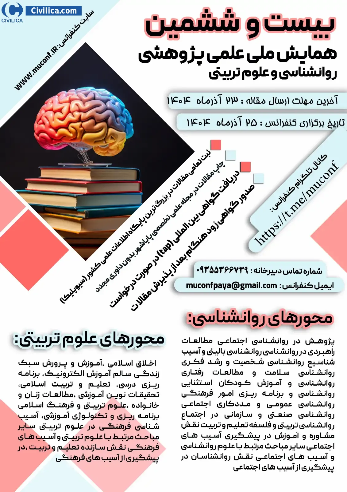 The 26th National Scientific Research Conference on Psychology and Educational Sciences In date 2025-12-16 by ,موسسه پایاشهرمجله پایاشهردبیرخانه دائمی کنفرانس in City Shirvan will be held.Since the conference held officially, all of this Conference paper and proceedings will be indexed in the Civilica database and Iranian Consortium of National Content (ICNC) and you can have full confidence.
