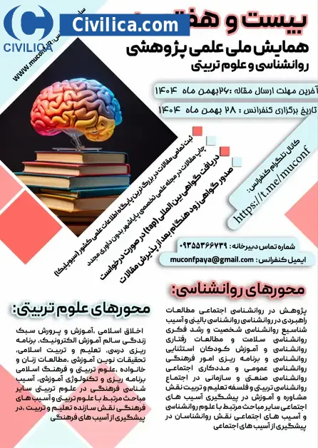The 27th National Scientific Research Conference on Psychology and Educational Sciences In date 2026-02-17 by ,موسسه پایاشهرمجله علمی تخصصی پایاشهردبیرخانه دائمی کنفرانس in City Shirvan will be held.Since the conference held officially, all of this Conference paper and proceedings will be indexed in the Civilica database and Iranian Consortium of National Content (ICNC) and you can have full confidence.