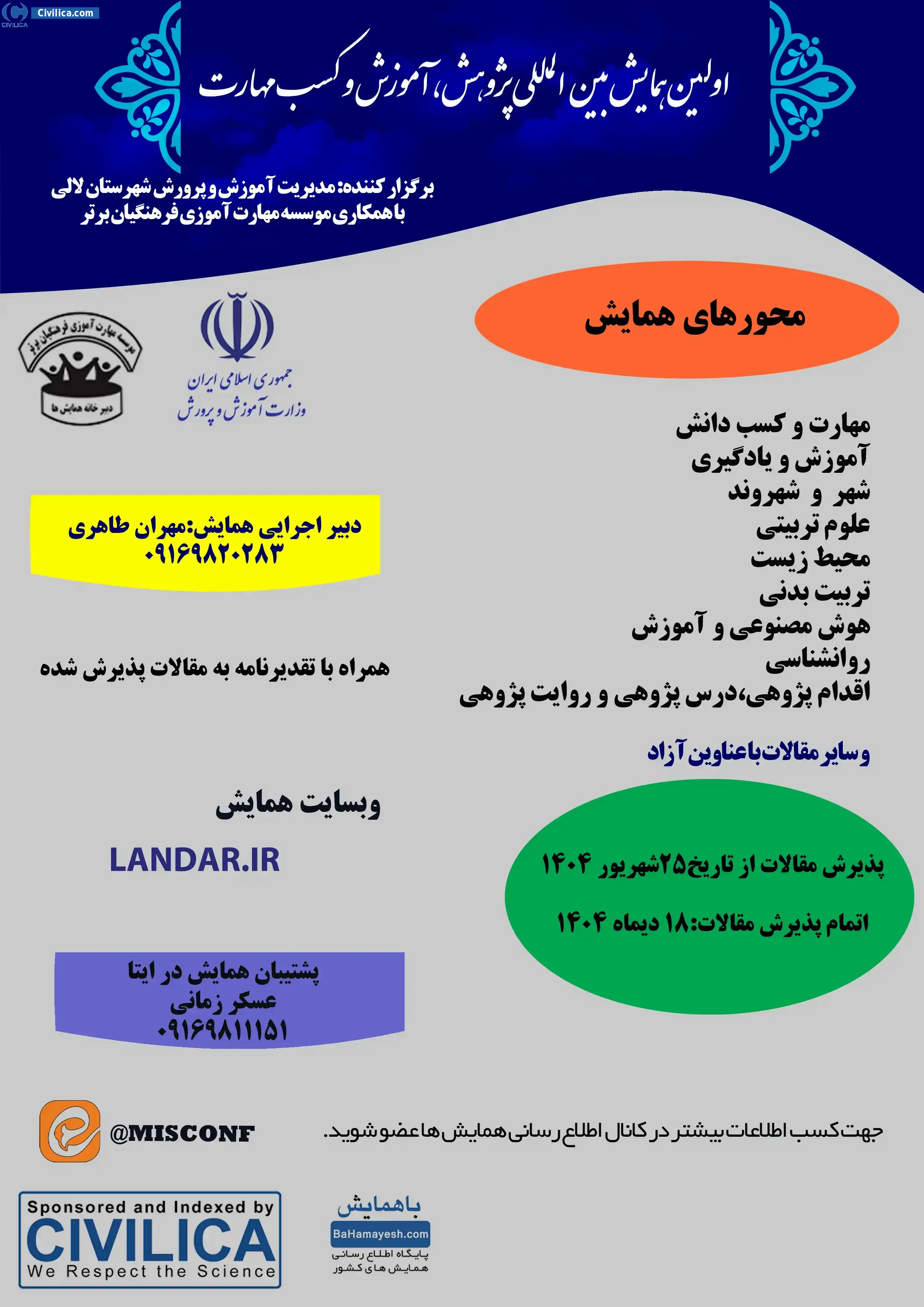 The First International Conference on Research, Education and Skills Acquisition In date 2025-12-31 by ,آموزش و پرورش لالیموسسه مهارت آموزش فرهنگیان برتر in City Masjed Soleyman will be held.Since the conference held officially, all of this Conference paper and proceedings will be indexed in the Civilica database and Iranian Consortium of National Content (ICNC) and you can have full confidence.