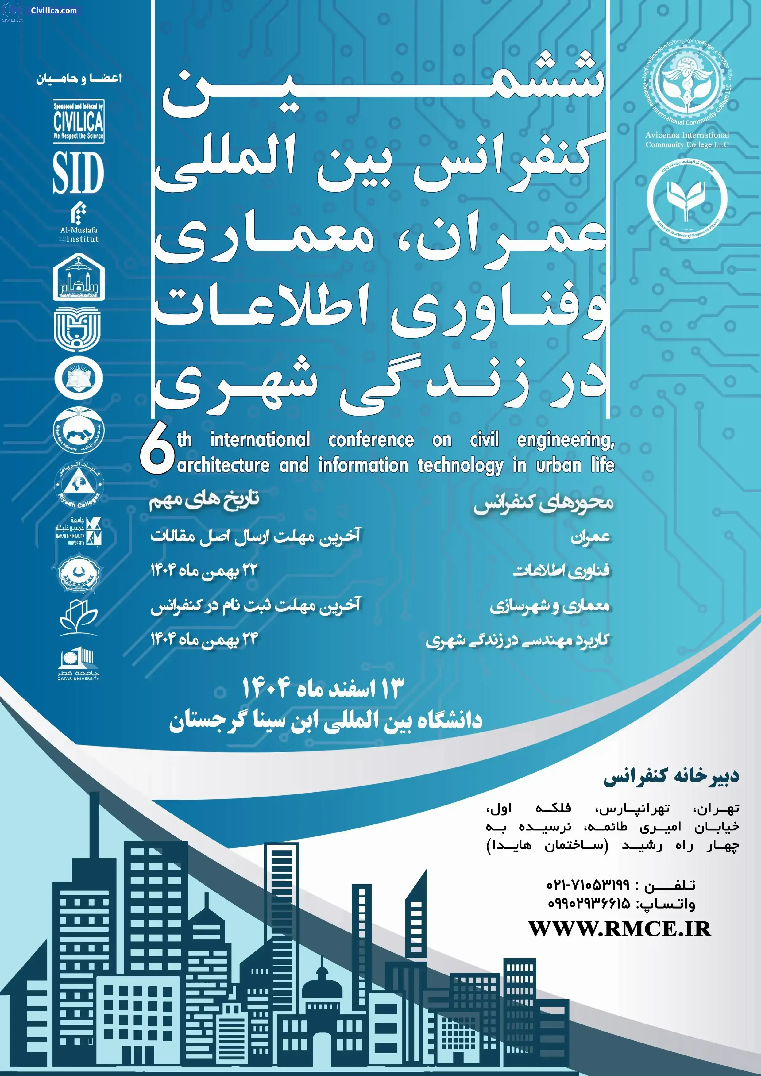 6th international conference on civil engineering, architecture and information technology in urban life In date 2026-03-04 by ,دانشگاه بین المللی ابن سینا گرجستان با همکاری موسسه تحقیقاتی رایمند پژوه will be held.Since the conference held officially, all of this Conference paper and proceedings will be indexed in the Civilica database and Iranian Consortium of National Content (ICNC) and you can have full confidence.