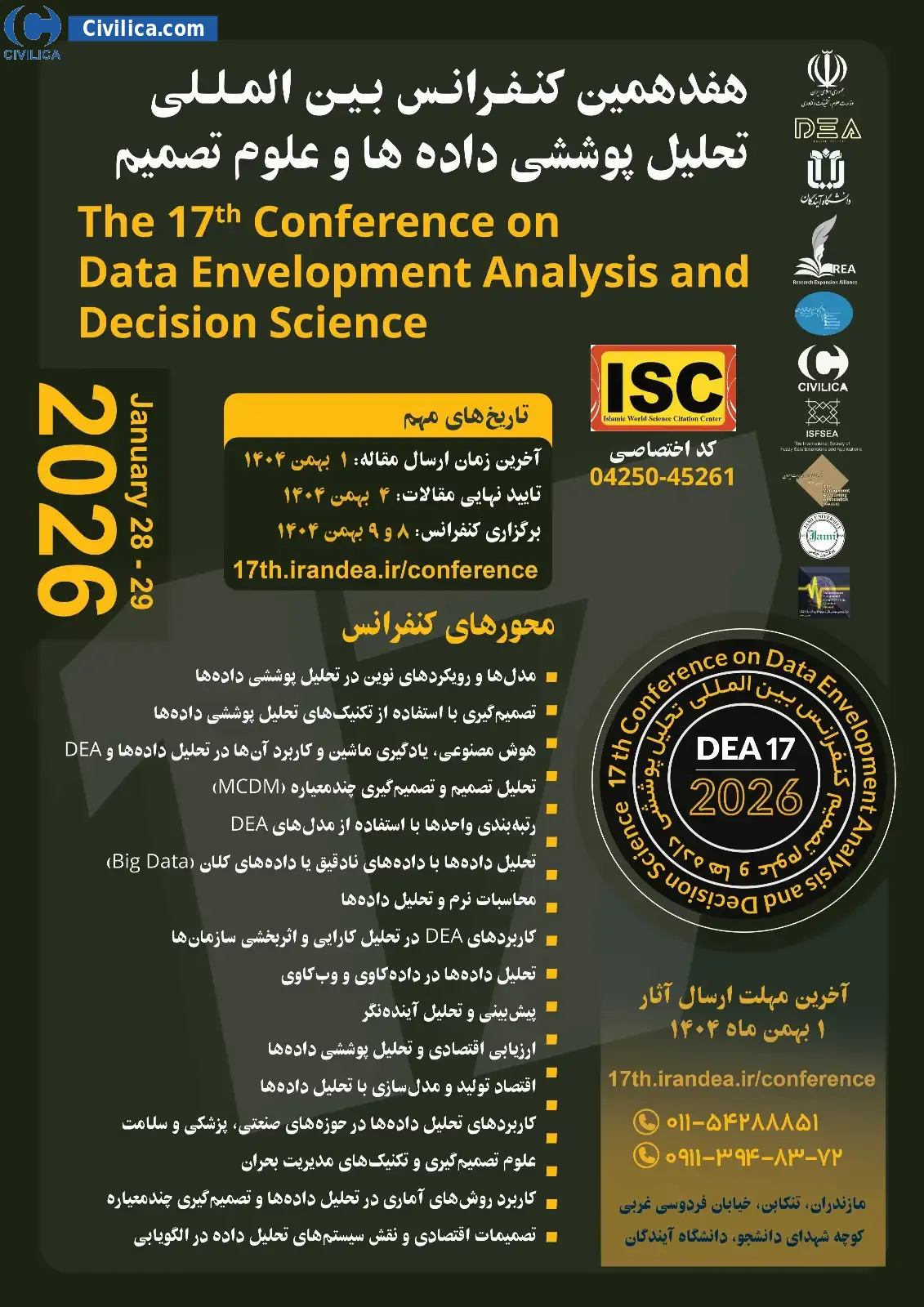 17th International Conference on Data Envelopment Analysis and Decision Sciences In date 2026-01-28 by Ayandegan Institute of Higher Education, انجمن ایرانی تحلیل پوششی داده ها in City Tonekabon will be held.Since the conference held officially, all of this Conference paper and proceedings will be indexed in the Civilica database and Iranian Consortium of National Content (ICNC) and you can have full confidence.