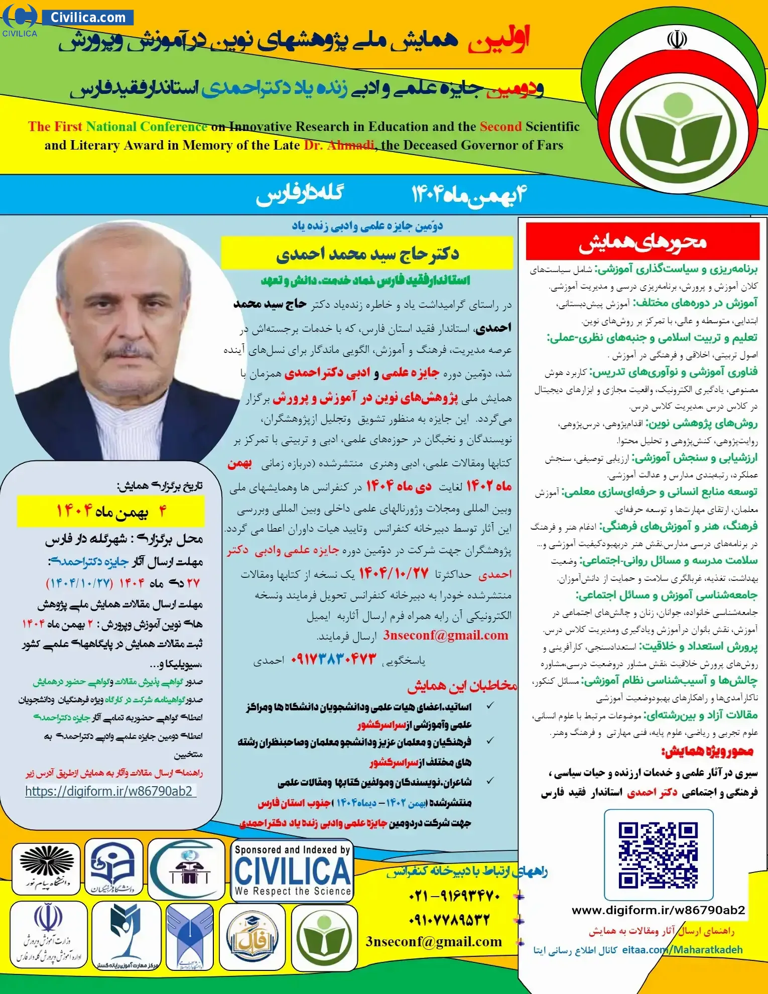The First National Conference on Innovative Research in Education and the Second Scientific and Literary Award in Memory of the Late Dr. Ahmadi, the Deceased Governor of Fars In date 2026-01-24 by ,دانشگاهها ومراکز علمی آموزشی ودانشگاهی ، مرکز مهارت آموزی رایانه گستر،ادارات آموزش وپرورش و ستاد جایزه علمی وادبی دکنر احمدی موسسات علمی آموزشی دانشگاهی in City Galleh dar will be held.Since the conference held officially, all of this Conference paper and proceedings will be indexed in the Civilica database and Iranian Consortium of National Content (ICNC) and you can have full confidence.