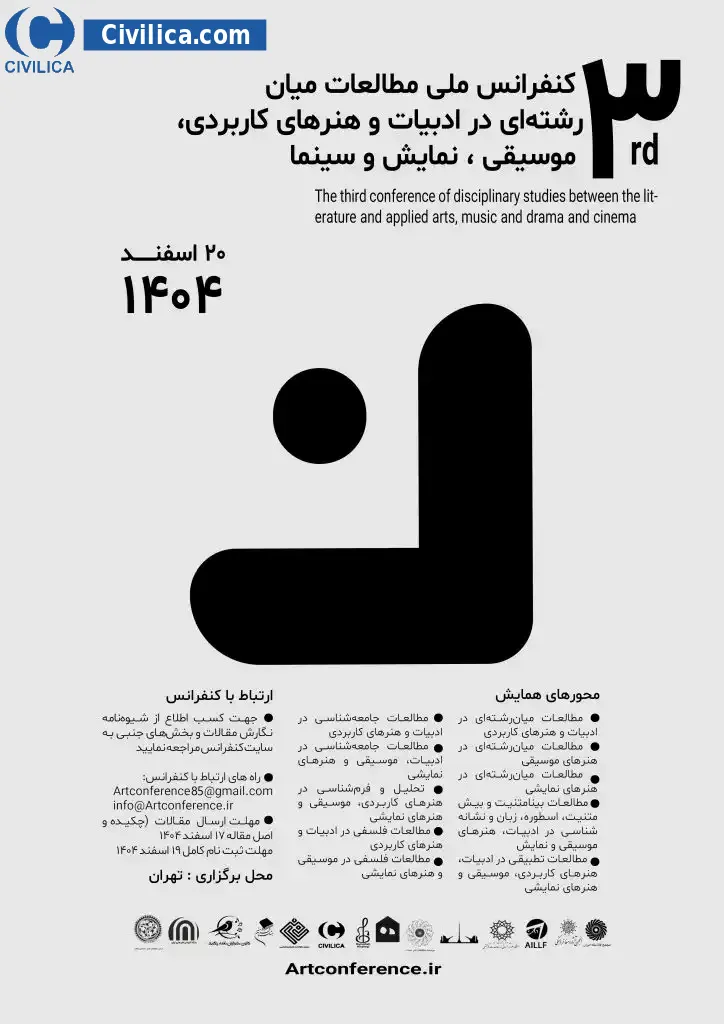 The third national conference of interdisciplinary studies in literature and applied arts, music, theater and cinema In date 2026-03-11 by ,فصلنامه مطالعات هنر و زیبایی شناسی in City Tehran will be held.Since the conference held officially, all of this Conference paper and proceedings will be indexed in the Civilica database and Iranian Consortium of National Content (ICNC) and you can have full confidence.