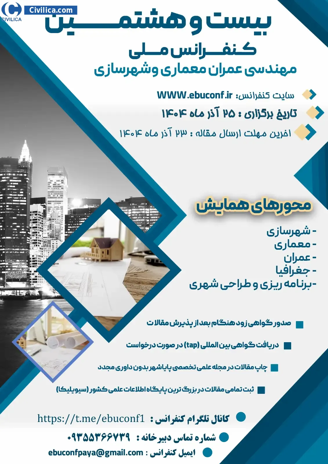 The 28th National Conference on Civil Engineering, Architecture and Urban Planning In date 2025-12-16 by ,موسسه پایاشهر دبیرخانه دائمی کنفرانسمجله علمی تخصصی پایاشهر in City Shirvan will be held.Since the conference held officially, all of this Conference paper and proceedings will be indexed in the Civilica database and Iranian Consortium of National Content (ICNC) and you can have full confidence.