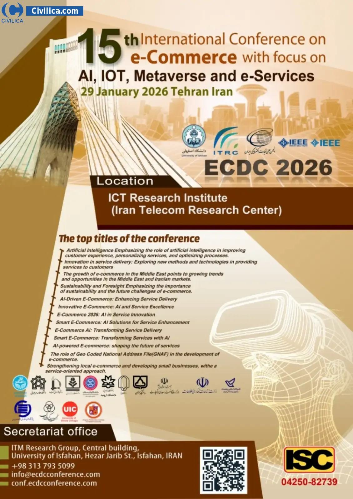15th International Conference on e-commerce with focus on AI, IOT, Metaverse and e-Services In date 2026-01-29 by University of Isfahan,دانشگاه اصفهان- گروه پژوهشی ITM in City Tehran will be held.Since the conference held officially, all of this Conference paper and proceedings will be indexed in the Civilica database and Iranian Consortium of National Content (ICNC) and you can have full confidence.