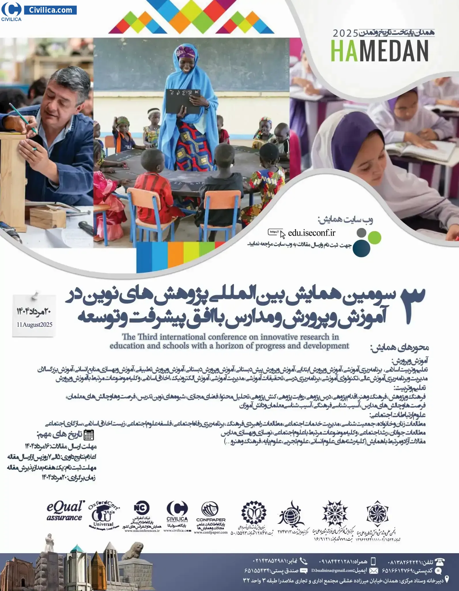 The Third international conference on innovative research in education and schools with a horizon of progress and development In date 2025-08-11 by ,مرکزهمایش ها و کنفرانس های بوعلی سینا، انجمن علمی دانش پژوهان بوعلی سینا in City Hamadan was held. please refer to the following link to download all the papers of conference proceedings: Proceedings The Third international conference on innovative research in education and schools with a horizon of progress and development