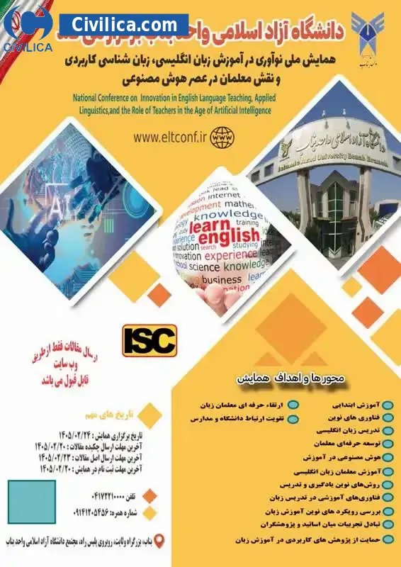 National Conference on Innovation in English Language Teaching, Applied Linguistics, and Teachers’ Role in the AI Era In date 2026-05-14 by Islamic Azad University of Bonab, in City bonab will be held.Since the conference held officially, all of this Conference paper and proceedings will be indexed in the Civilica database and Iranian Consortium of National Content (ICNC) and you can have full confidence.