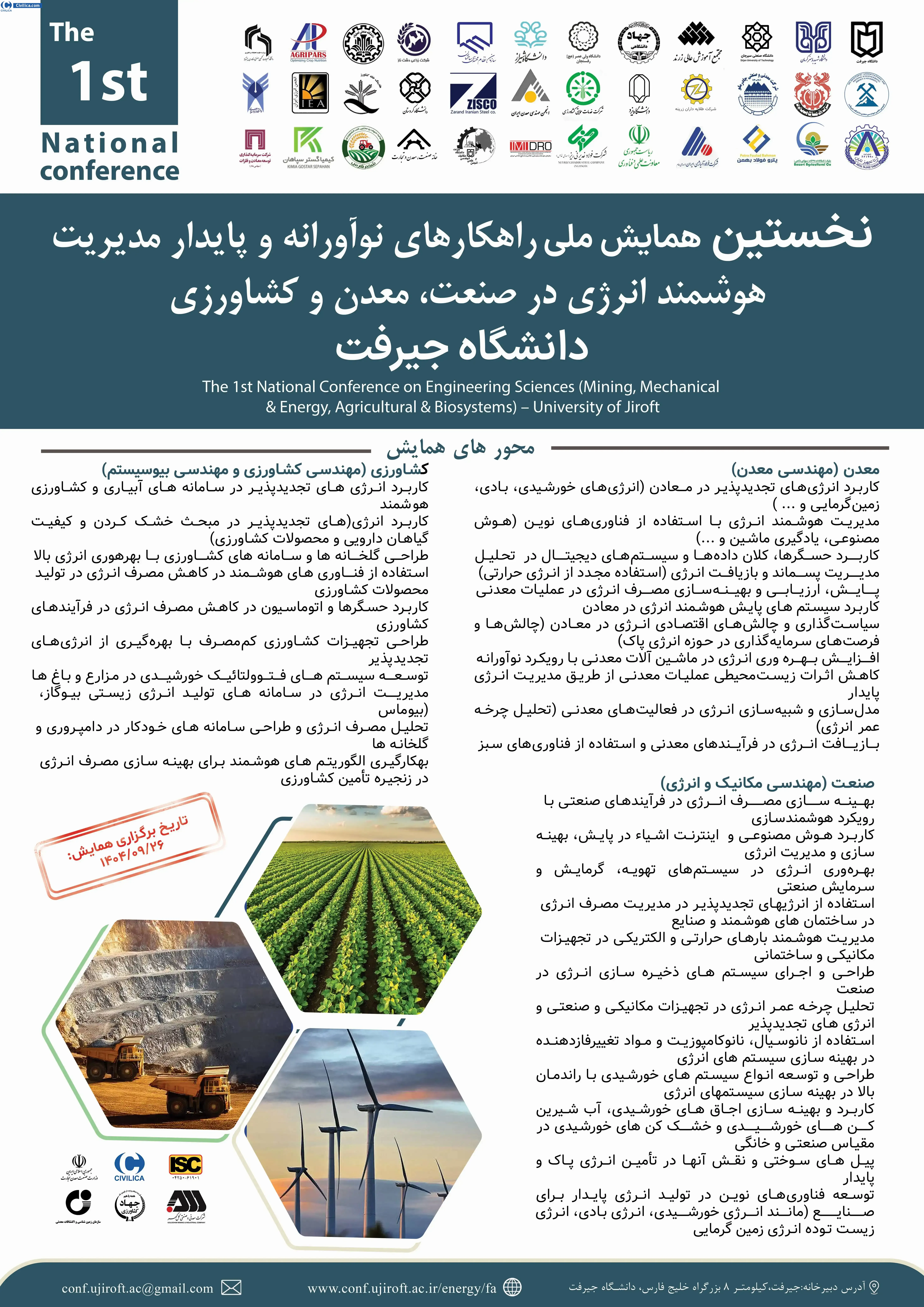 The 1st National Conference on Engineering Science (Mining, Mechanical & Energy, Agricultural & Biosystems) - University of Jiroft, Iran. In date 2025-12-17 by Jiroft University, in City Jiroft will be held.Since the conference held officially, all of this Conference paper and proceedings will be indexed in the Civilica database and Iranian Consortium of National Content (ICNC) and you can have full confidence.