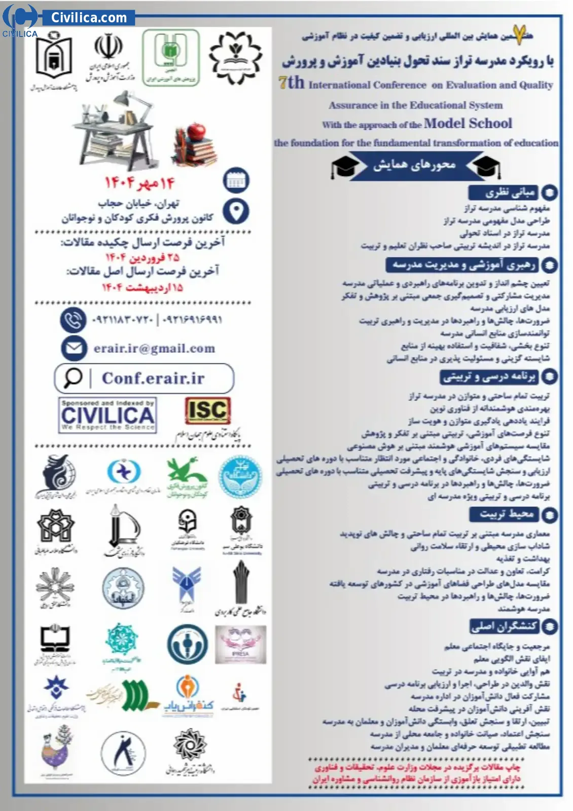 7th International Model SchoolConference: Design, Implementation, Evaluation, And The Quality Assurance In date 2025-10-05 by ,Iranian Educational Research Association، IRAN Educational Psychology Associationوزارت آموزش و پرورش پژوهشگاه مطالعات آموزش و پرورش in City Tehran was held. please refer to the following link to download all the papers of conference proceedings: Proceedings 7th International Model SchoolConference: Design, Implementation, Evaluation, And The Quality Assurance