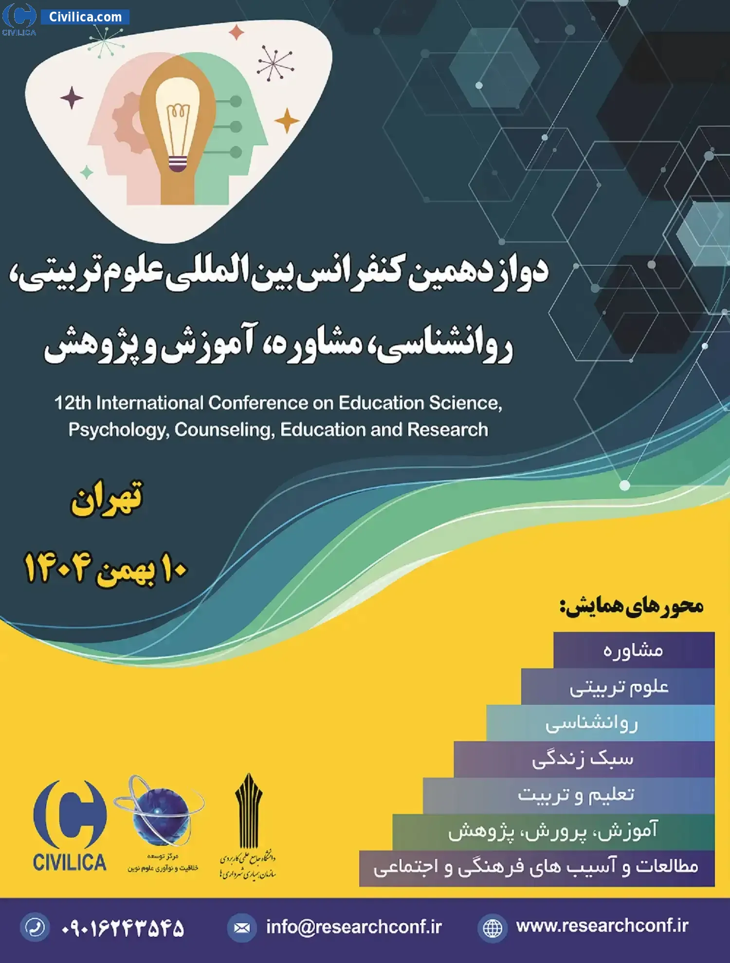 12th International Conference on Education Science, Psychology, Counseling, Education and Research In date 2026-01-30 by ,دانشگاه جامع علمی کاربردی سازمان همیاری شهرداری ها و مرکز توسعه خلاقیت و نوآوری علوم نوین in City Tehran will be held.Since the conference held officially, all of this Conference paper and proceedings will be indexed in the Civilica database and Iranian Consortium of National Content (ICNC) and you can have full confidence.