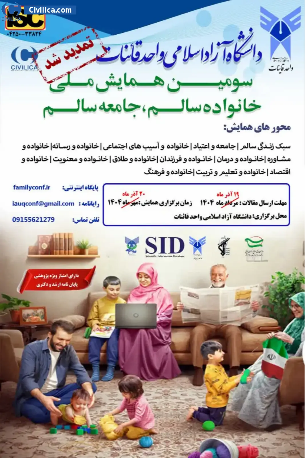 The Third National Conference on Healthy Family, Healthy Society In date 2025-12-11 by Islamic Azad University of Ghayenat, in City Qaen will be held.Since the conference held officially, all of this Conference paper and proceedings will be indexed in the Civilica database and Iranian Consortium of National Content (ICNC) and you can have full confidence.