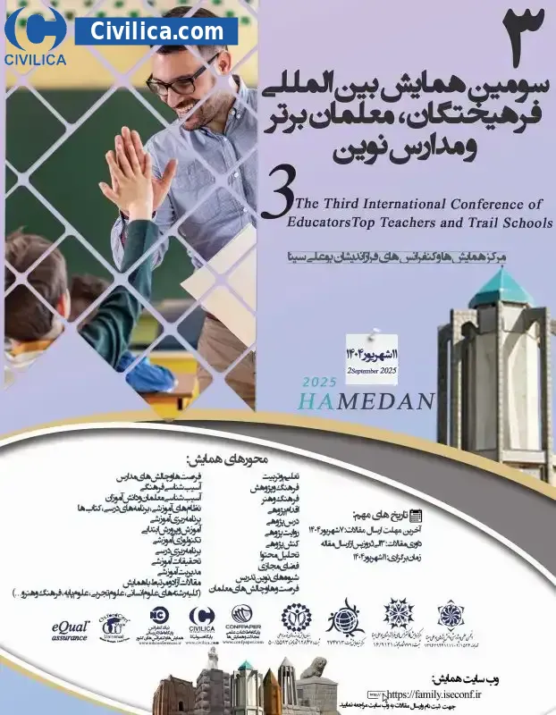 The Third International Conference of Educators, Top Teachers and Trail Schools In date 2025-09-02 by ,مرکزهمایش ها و کنفرانس های بوعلی سینا، انجمن علمی دانش پژوهان بوعلی سینا in City Hamadan was held. please refer to the following link to download all the papers of conference proceedings: Proceedings The Third International Conference of Educators, Top Teachers and Trail Schools
