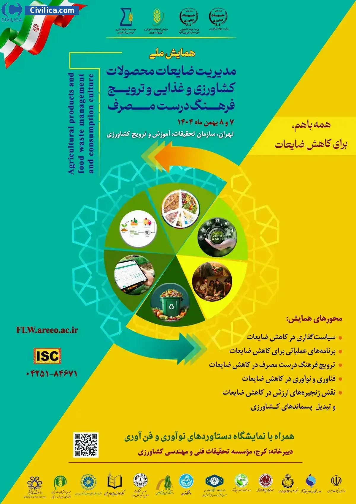 National Conference on Agricultural and Food Waste Management and Promoting a Culture of Proper Consumption In date 2026-06-05 by ,سازمان تحقیقات، آموزش و ترویج کشاورزیدفتر نماینده ولی فقیه در وزارت جهاد کشاورزیمؤسسه تحقیقات فنی و مهندسی کشاورزی in City Tehran will be held.Since the conference held officially, all of this Conference paper and proceedings will be indexed in the Civilica database and Iranian Consortium of National Content (ICNC) and you can have full confidence.