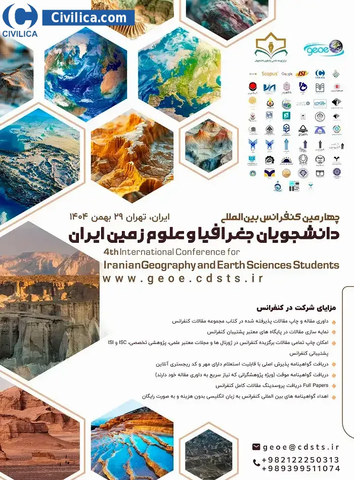 Fourth International Conference for Iranian Geography and Earth Sciences Students In date 2026-02-18 by ,دبیرخانه دائمی کنفرانس in City Tehran will be held.Since the conference held officially, all of this Conference paper and proceedings will be indexed in the Civilica database and Iranian Consortium of National Content (ICNC) and you can have full confidence.