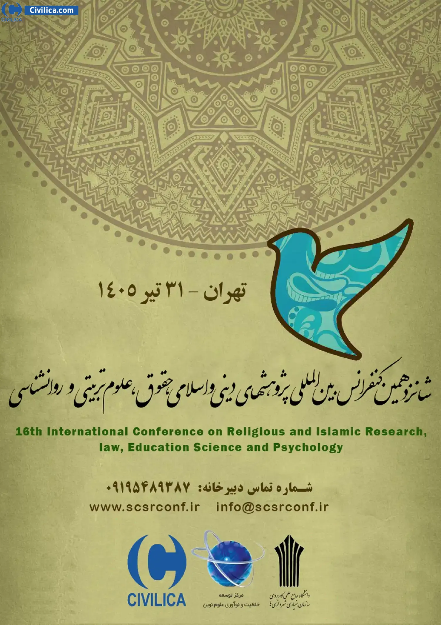 16th International Conference on Religious and Islamic Research, law, Education Science and Psychology In date 2026-07-22 by ,دانشگاه جامع علمی کاربردی سازمان همیاری شهرداری ها و مرکز توسعه خلاقیت و نوآوری علوم نوین in City Tehran will be held.Since the conference held officially, all of this Conference paper and proceedings will be indexed in the Civilica database and Iranian Consortium of National Content (ICNC) and you can have full confidence.