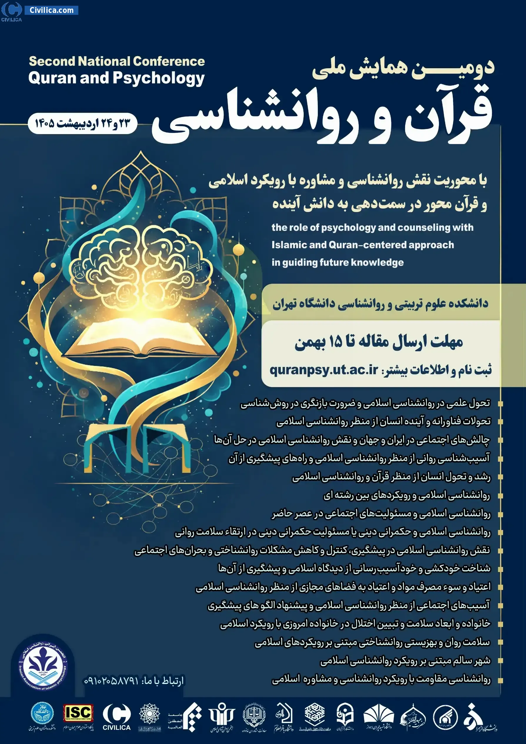The 2nd national conference Quran and psychology In date 2026-05-13 by University of Tehran,انجمن ایرانی روانشناسی اسلامی in City Tehran will be held.Since the conference held officially, all of this Conference paper and proceedings will be indexed in the Civilica database and Iranian Consortium of National Content (ICNC) and you can have full confidence.