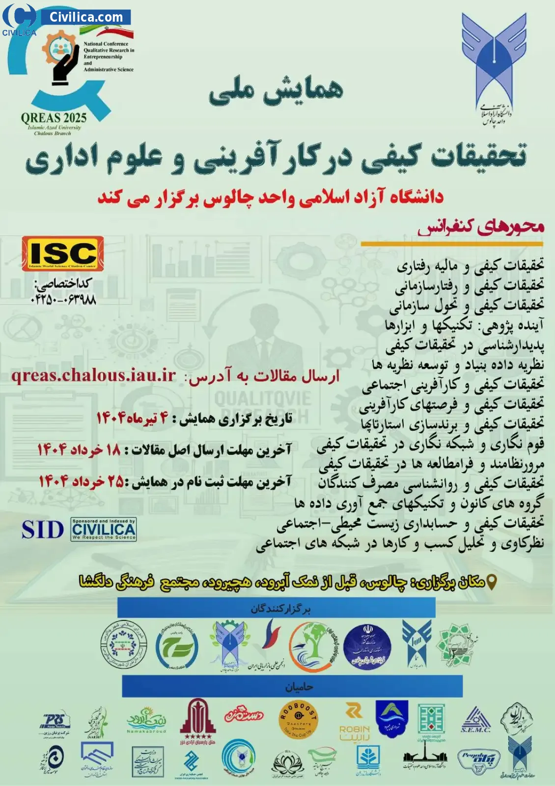 National Conference on Qualitative Research in Entrepreneurship and Administrative Sciences In date 2025-05-18 by Islamic Azad University of Chalus, in City Chalus was held. please refer to the following link to download all the papers of conference proceedings: Proceedings National Conference on Qualitative Research in Entrepreneurship and Administrative Sciences