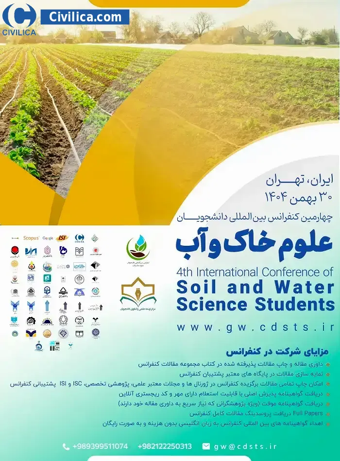 Fourth International Conference of Soil and Water Science Students In date 2026-02-19 by ,مرکز توسعه علمی و فناوری دانشجویان in City Tehran will be held.Since the conference held officially, all of this Conference paper and proceedings will be indexed in the Civilica database and Iranian Consortium of National Content (ICNC) and you can have full confidence.